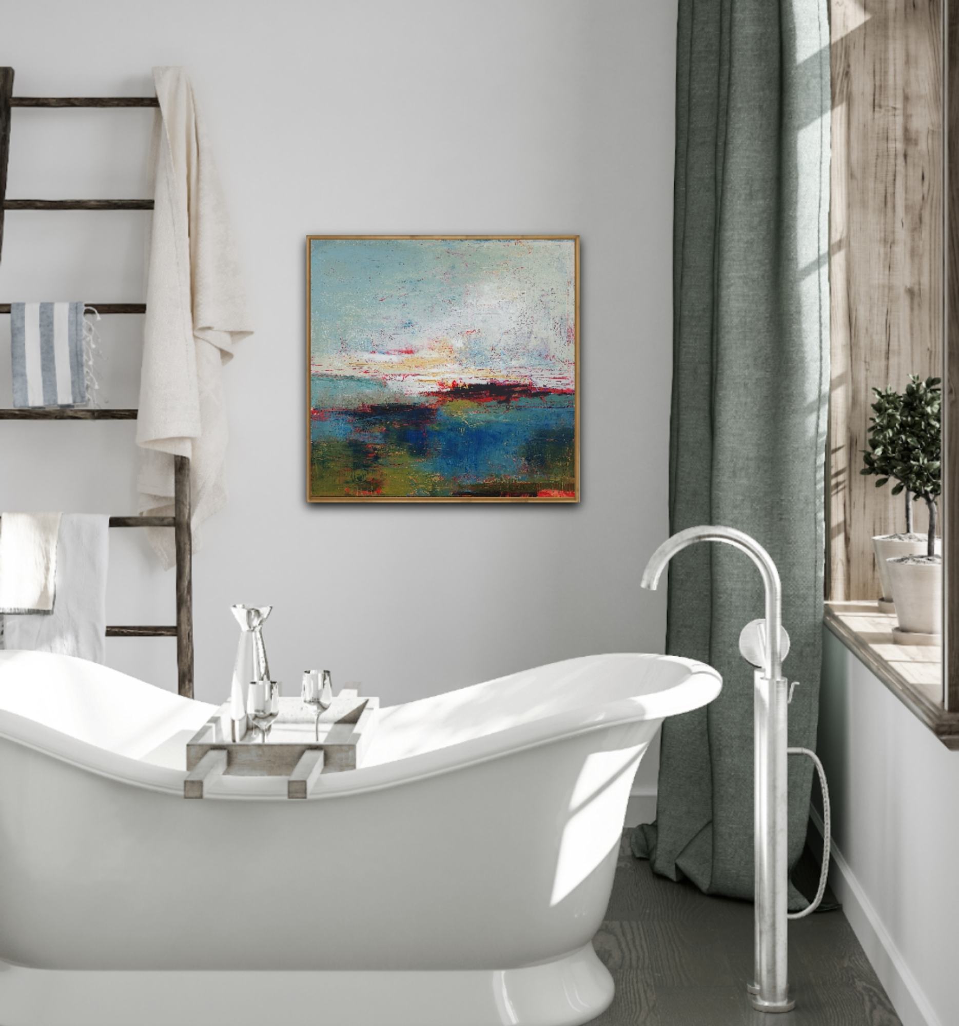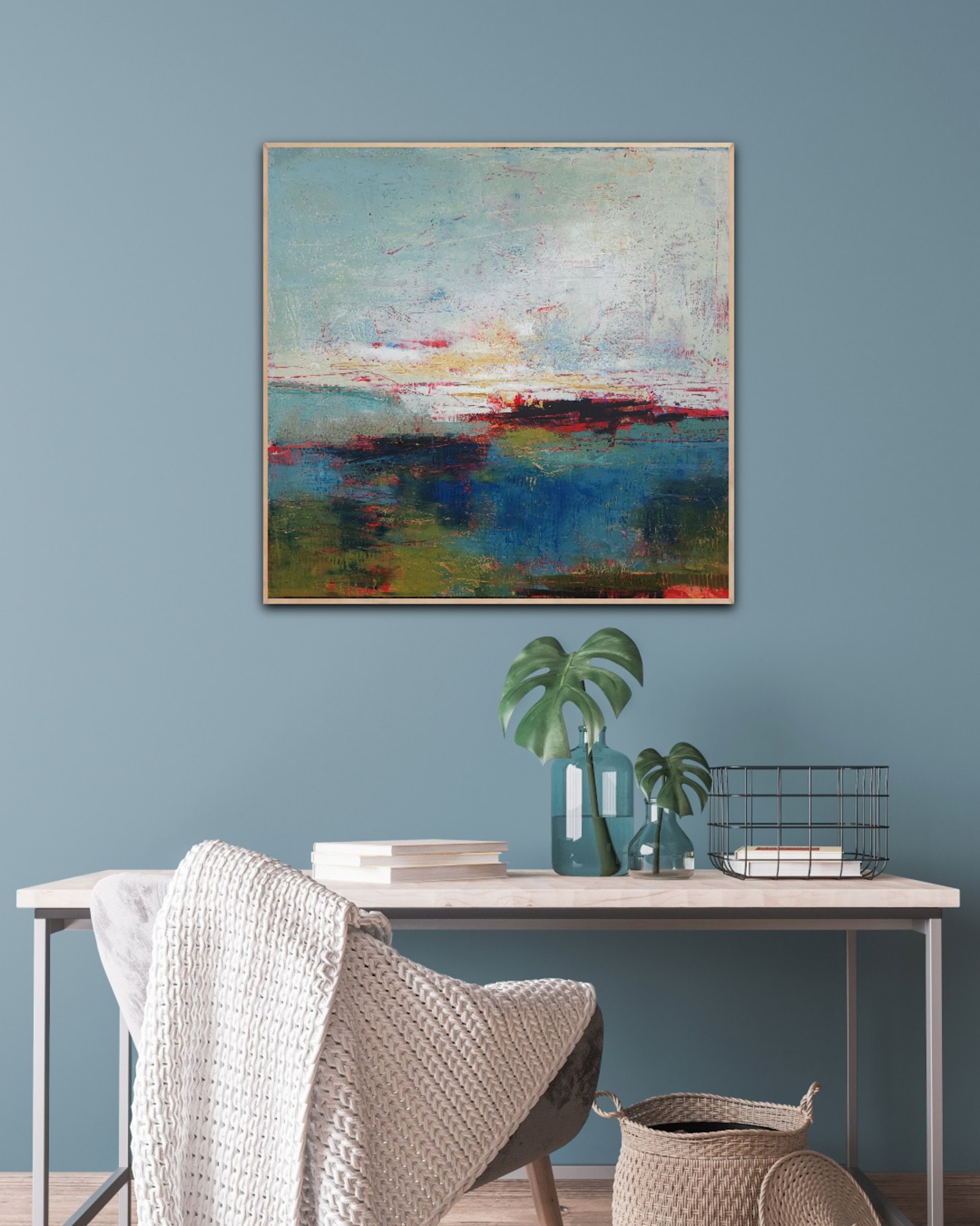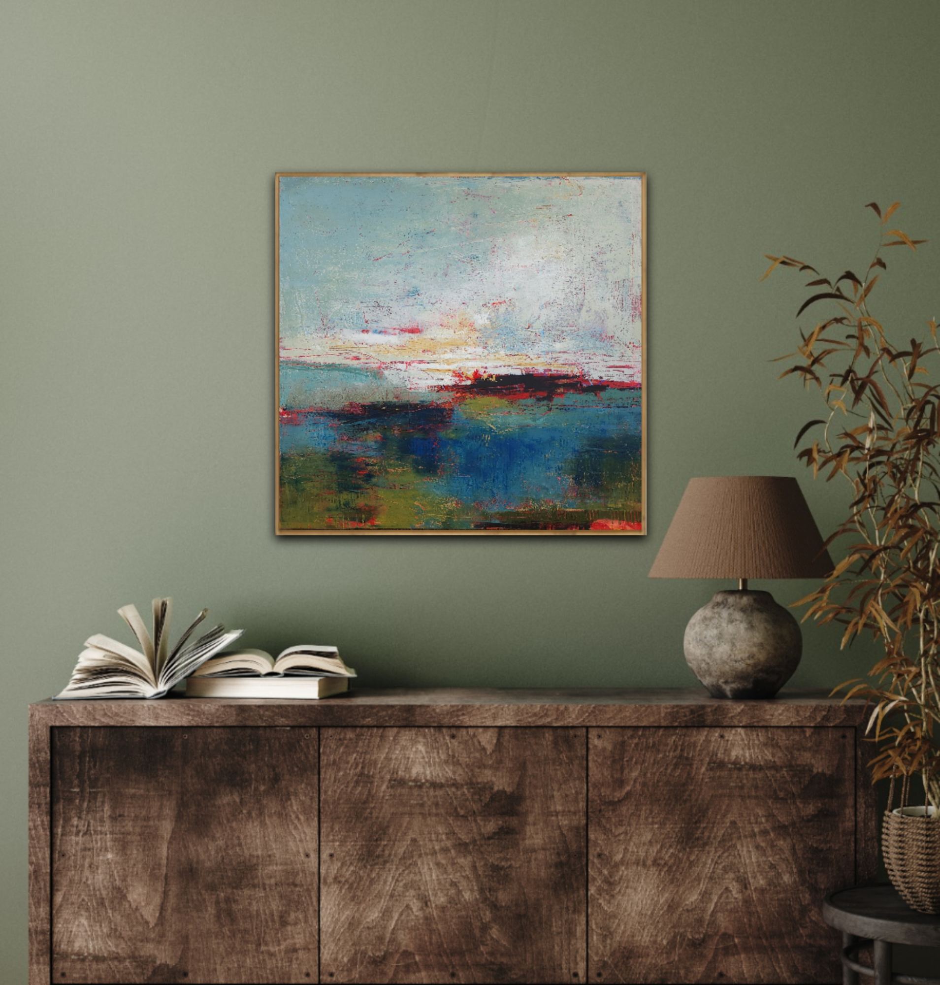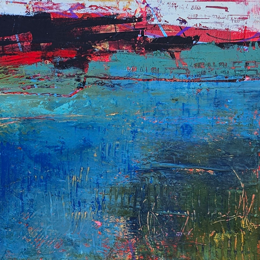 Heavily textured oil and cold wax abstracted landscape painting inspired by the Texas Hill Country in the springtime. A variety of removal techniques were used to reveal bits of collage or mark making for added depth. Deep wood panel with natural wood waxed sides.
