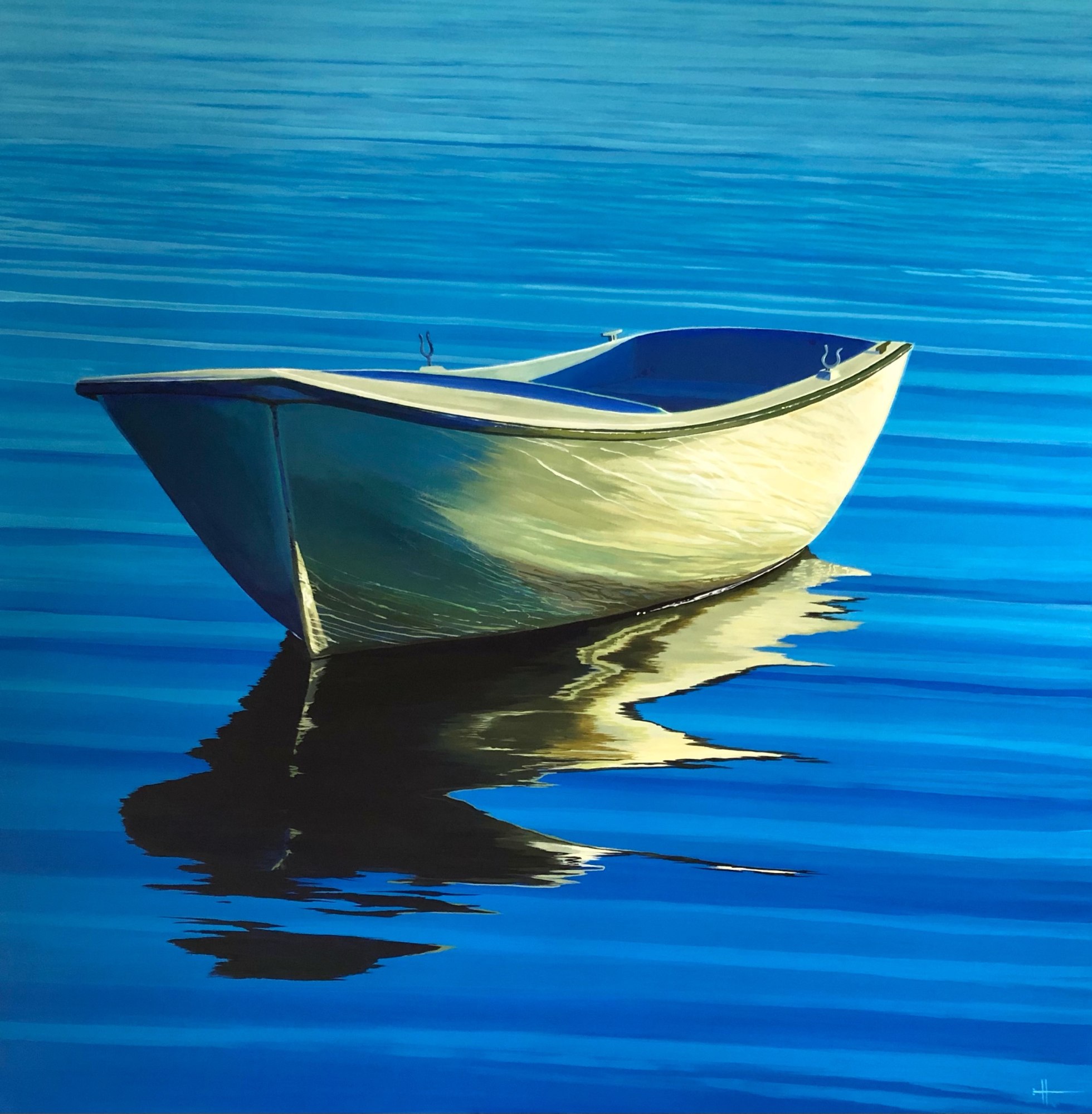 A drifting, abandoned boat with no name creates a mystique that haunts the viewer. And yet, it is inviting and not forlorn, begging for a journey. I previously painted the same scene in a smaller format of 12"x12" but this one is much larger. This painting has 1.5 inch gallery wrapped sides with an ultra matte finish, ready to hang.
