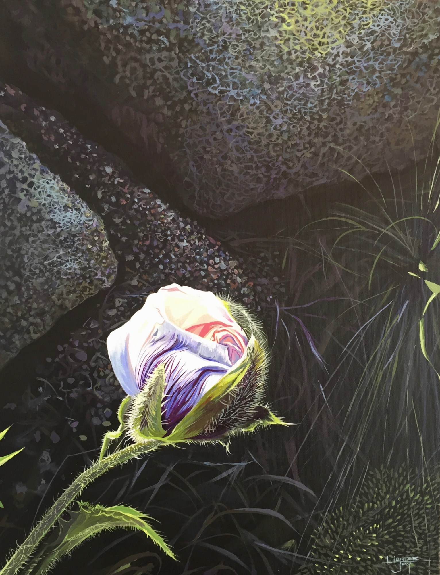 A white poppy on the verge of blooming. I call it "Persistence" because of the bright white standing out against the darkness. A metaphor for our times.