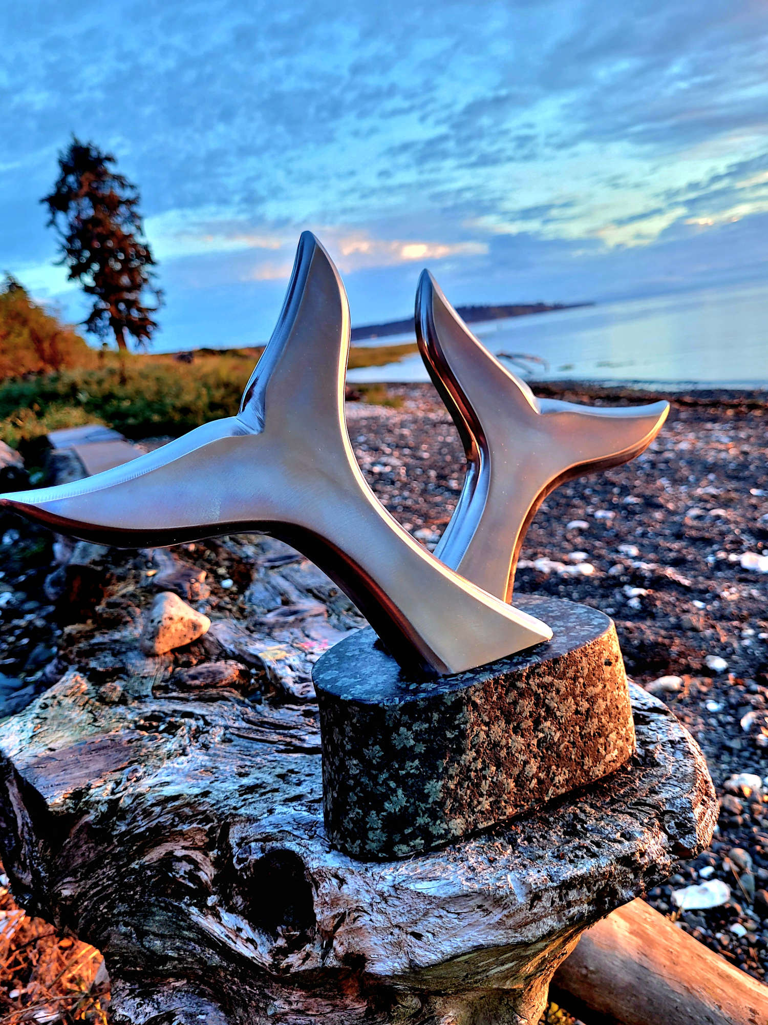 100% hand forged and welded Stainless Steel whales tails, mounted to flowerstone.
