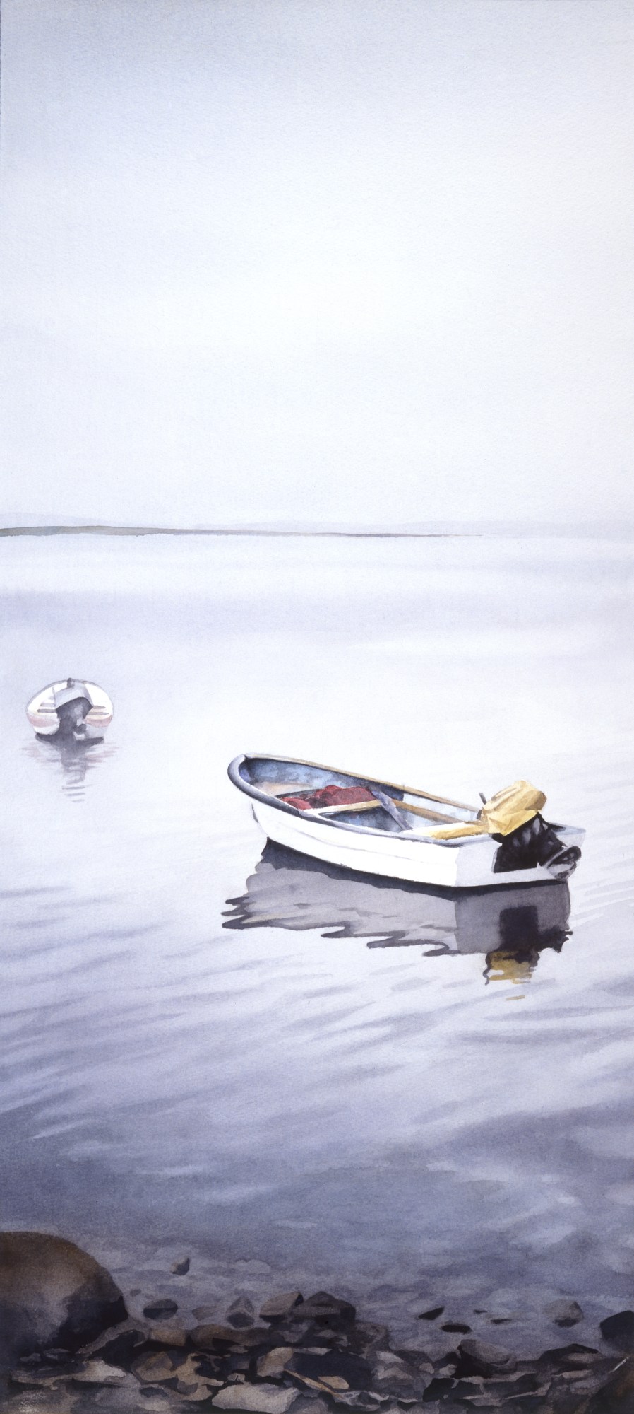 The painting depicts two small panga fishing boats, moored in a serene and tranquil Sea of Cortez. The subdued blue waters of the sea merge seamlessly into the sky, creating a sense of infinite space and serenity. The boats, awaiting their next fishing adventure, sit peacefully in the water, casting reflections onto the calm surface. The painting captures the idyllic and peaceful atmosphere of La Paz, where time seems to stand still, and the natural beauty of the sea dominates all senses. It is a snapshot of a moment frozen in time, a tribute to the timeless charm of the Mexican coast.