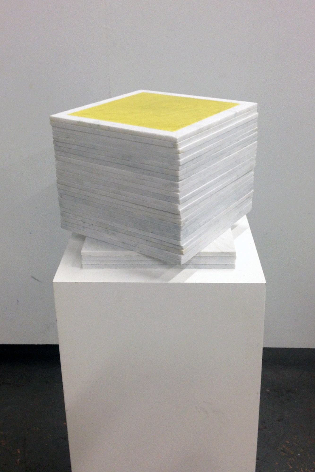 Fresco Stacks are 3 dimensional fresco pieces made up of the stacked marble plates and crowned with a plate carrying a fresco. It’s initial form is a perfect cube. It is up to the designer, curator or collector to set the positioning twist which can be rearranged at will and at any time. This is a unique and literally physical way to involve curator, designer and collector into the creation and the life of the piece of art. Donald Judd said that the space between his pieces is part of his sculpture – the actions/input of the person who has the piece is part of mine.