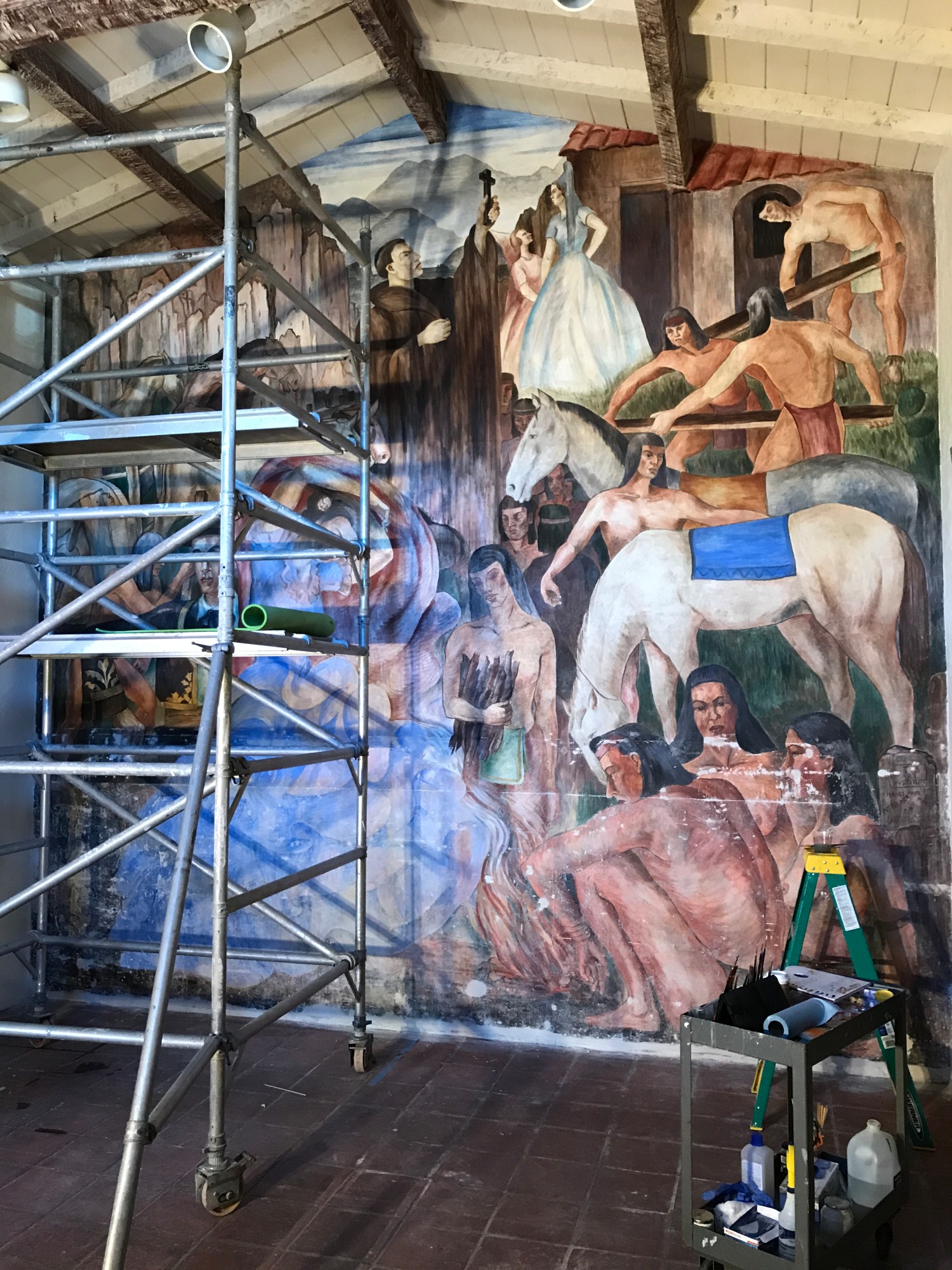 “The iconography of this piece is truly unique. The fresco is a beautiful pictorial description of the novel Ramona , written by Helen Hunt Jackson in 1884. Tradition- ally, large-scale frescos represent religious subjects. One of the functions frescos served in antiquity was to describe or teach a story or specific event almost always religious in nature using images as opposed to words, because the majority of people were unable to read.”