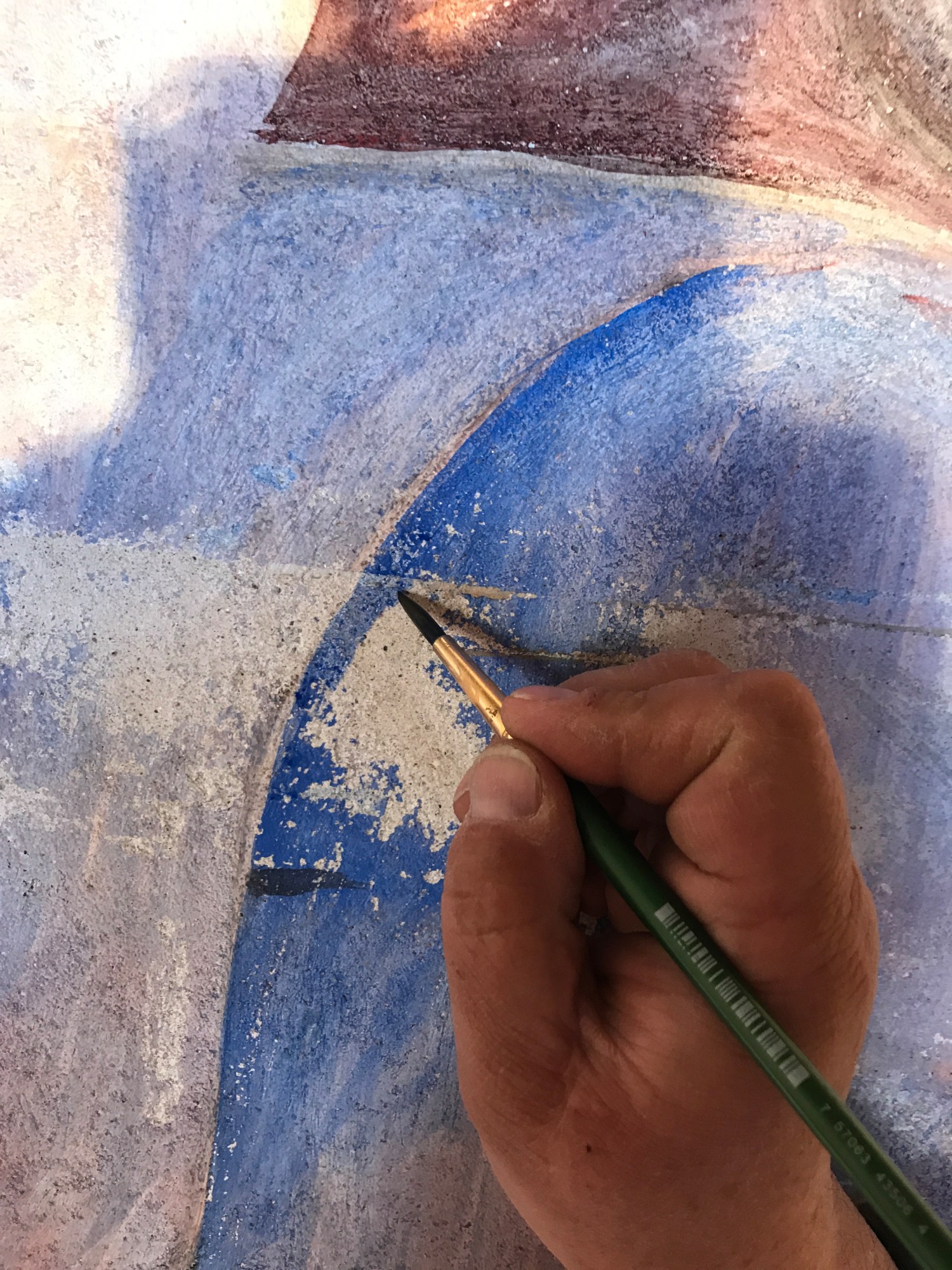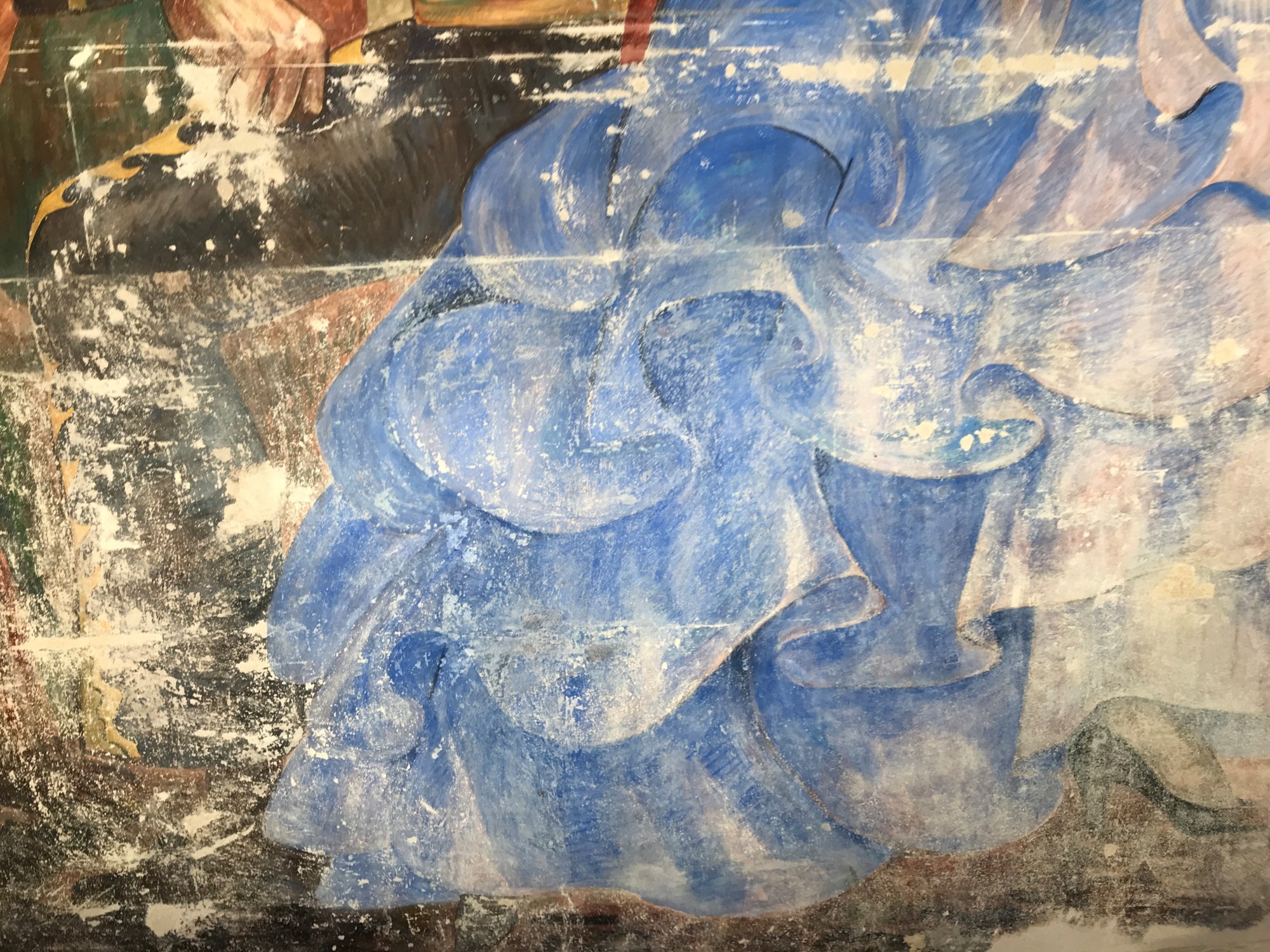 Conservationists iLia Anossov and Elisabetta Perfetti pains- takingly removed several layers of white paint that covered sixteen by three-and-a-half feet of the fresco, filled scratches and bolt-holes left from a board mounted to the wall, carefully matched the paint on the damaged portions, and gently overpainted age-damaged sections as necessary. By mid-March 2020, the conservation was complete.