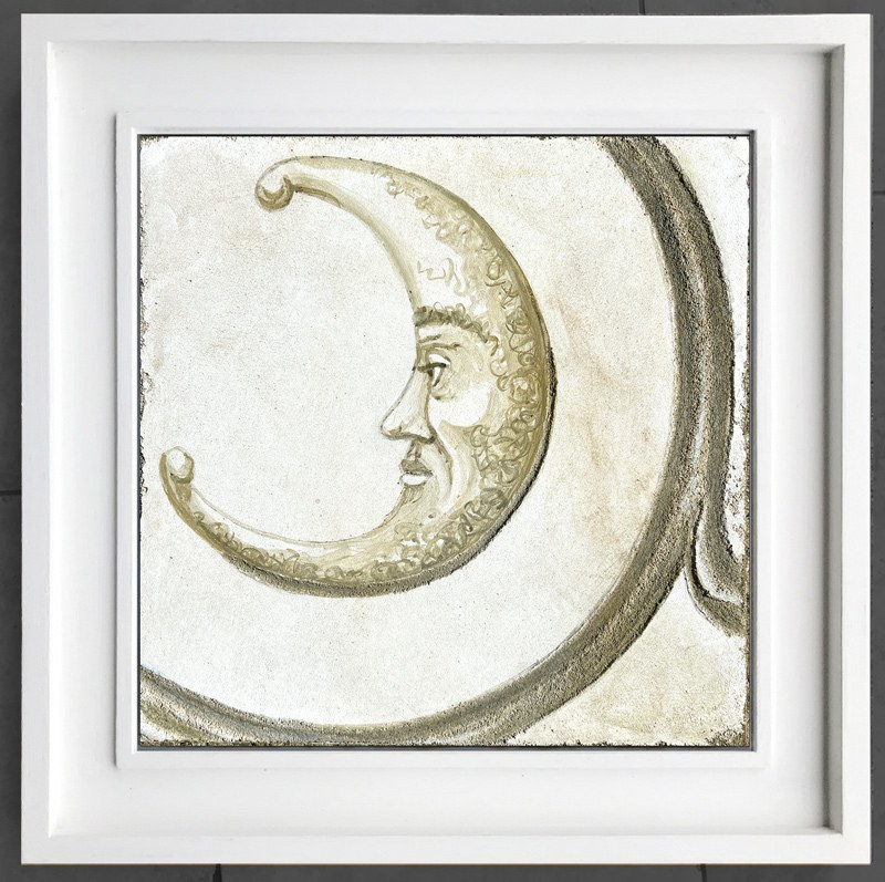 The Crescent Moon – Sgraffito Fresco Fragment – 16X16 on ceramic tile. An original study for the "Celestial Fresco Sgraffito" Fireplace Mantel by iLia Fresco, Beverly Hills, California 2024. Composition was inspired by classic folk and antiquity symbology.