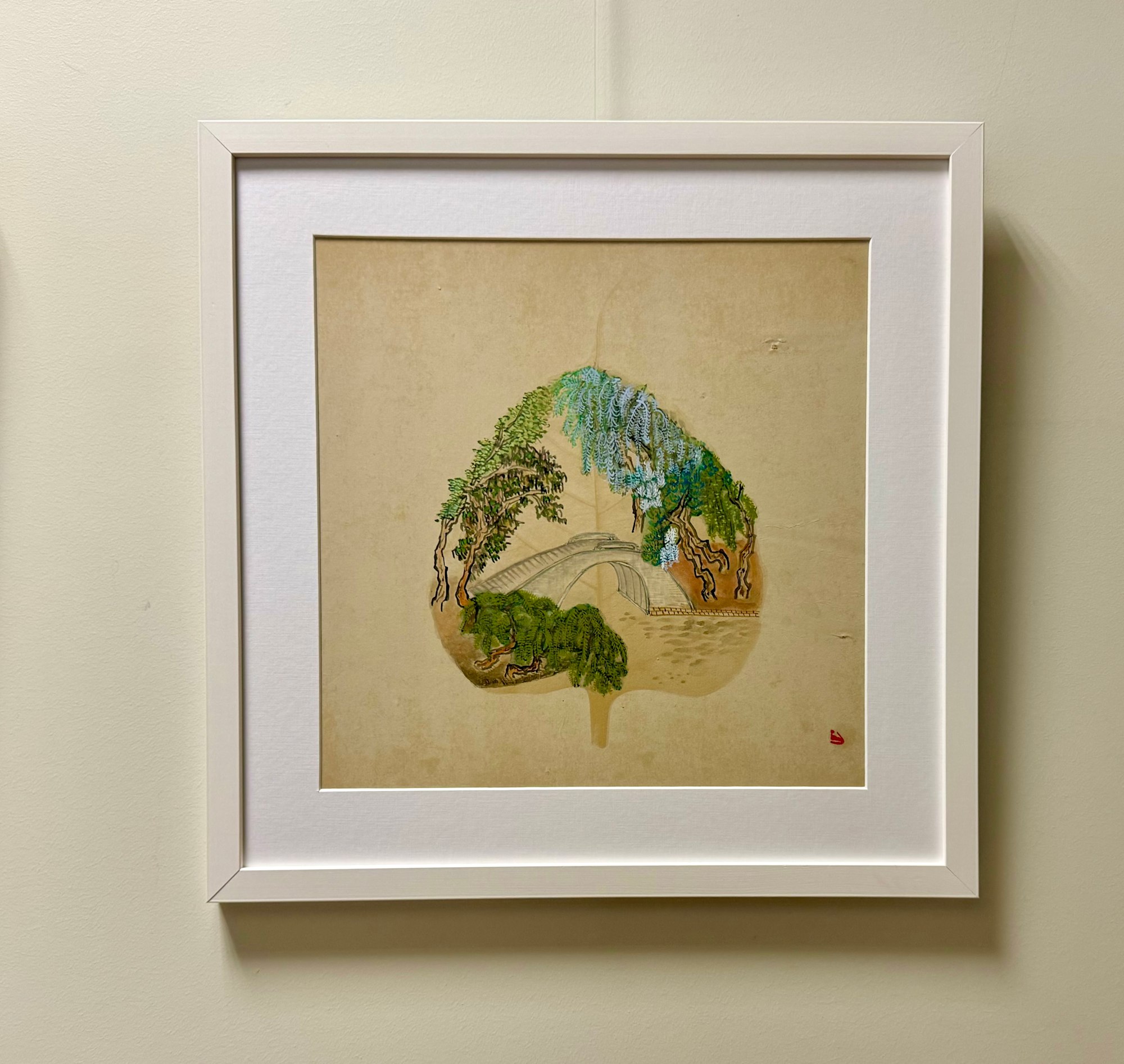 Tušas ir mineraliniai dažai ant sendinto ryžių popieriaus su lapo ornamentu. Popierius klijuotas ant putų kartono plokštės.
