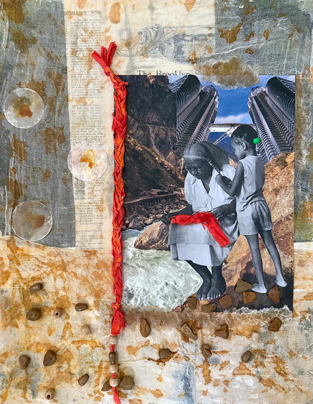 This mixed media piece on canvas evokes a nostalgic, intergenerational moment between an elder and a child, set against a surreal landscape blending rural and urban environments. The tactile elements like stones, beads, mesh, braided fabric, and old text evoke the textures of memory, heritage, and oral tradition. The thread becomes a symbol of lineage or life force, a shared cultural or familial history.