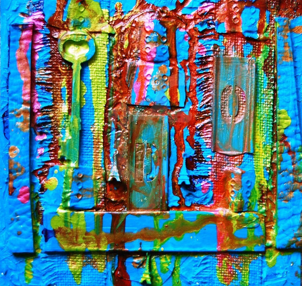 8x8 Mixed Media on a Wood Panel. Made from acrylic paint, leather strips, letter stencils, wooden key, acrylic inks, Eiffel Tower charms, brackets, and white burlap.