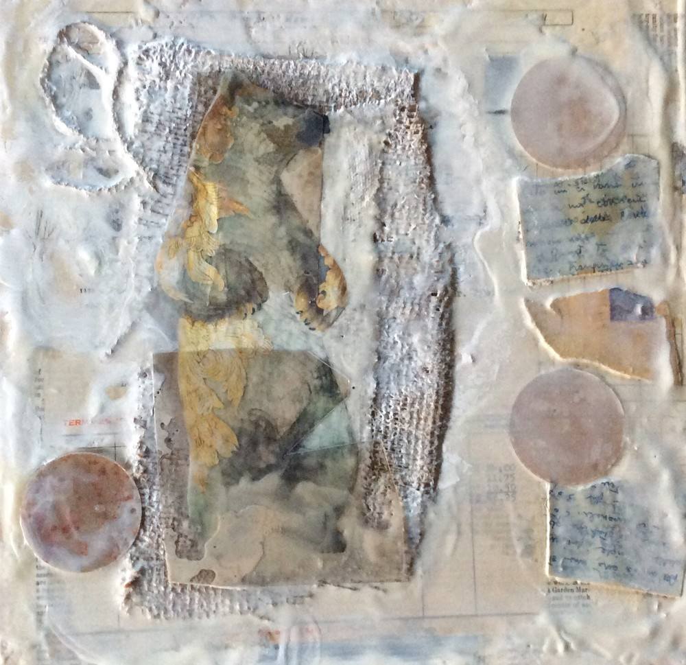 This mixed-media original painting is a 12 x 12 x 1.5 inch birch wood panel. This painting was created with layers of acrylic paints, vintage paper, encaustic paints, mica, vintage handwritten letters, plaster, hemp cloth, pen and ink.