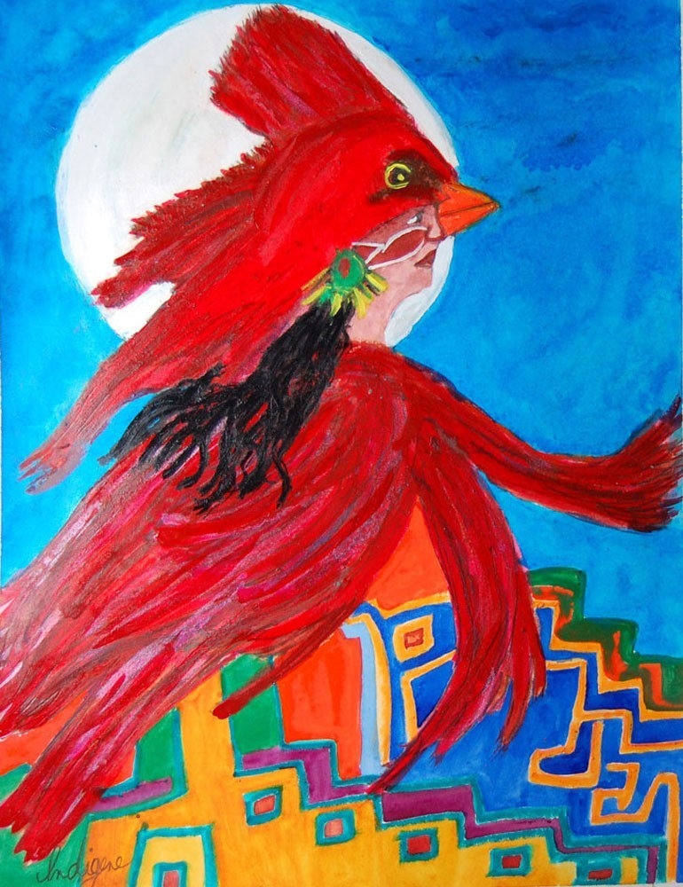 A large part of the symbolism of the cardinal comes from the brilliant red color of the males. Even its common name is derived from the royal red vestments worn by Catholic cardinals. I portrayed the brilliance of this bird in a feminine form and as a goddess.