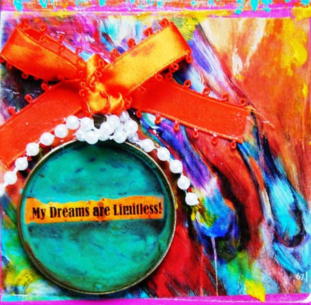 This is an original mixed media piece, on a 4" x 4" x 1.5" wood block. The canvas is layered with acrylic paint, beads, ribbon, mica, ink, pendant with quote and resin and photo, (piece is varnished for protection, signed and dated on the back.)