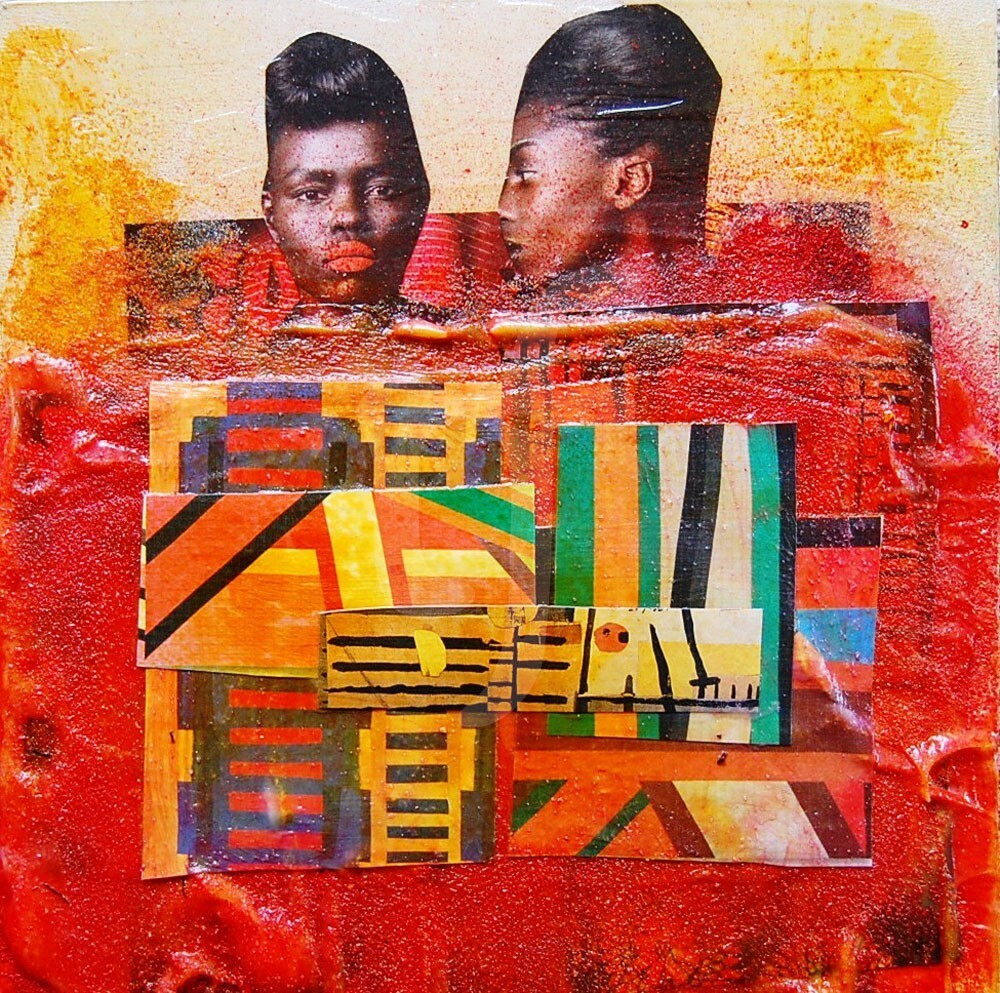 8x8 Mixed Media on a Wood Panel. Made from acrylic paint, handmade paper, layered textured glass with sand, acrylic ink, magazine scraps, and India ink.