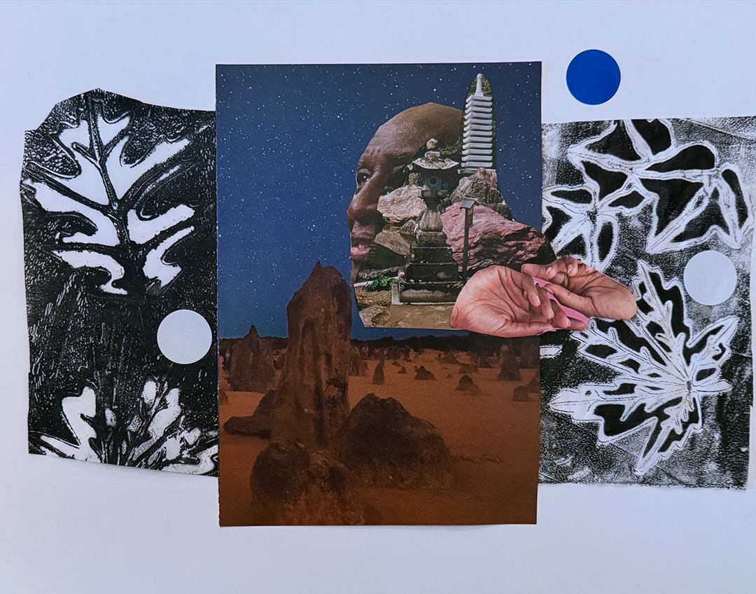 A complex collage combining cosmic energy, earthly elements, and landscape creating a journey through space and time.
