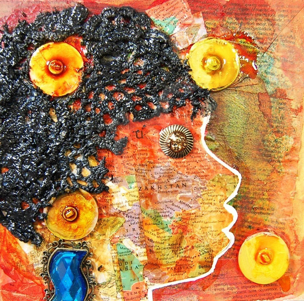 8x8 Mixed Media on a Wood Panel. Made from acylic Paint, doily, Antique buttons, faux jewel setting, maps,distress inks, acrylic inks, dictionary pages, and handmade paper.