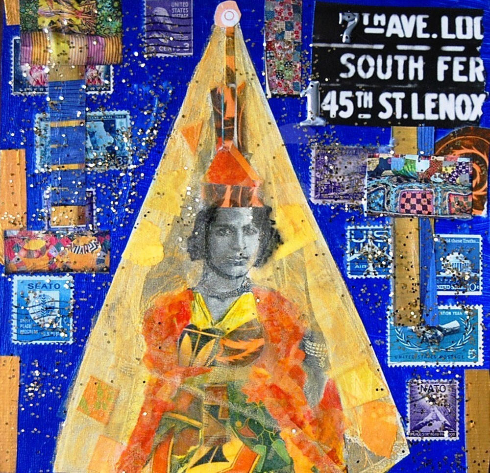 8x8 Mixed Media on a Wood Panel. Made from acrylic paint, duct tape, vintage postal stamps, handmade paper, magazine scraps, metal numbers, glitter, satin veil, cardboard, doily, and graphite pencil.