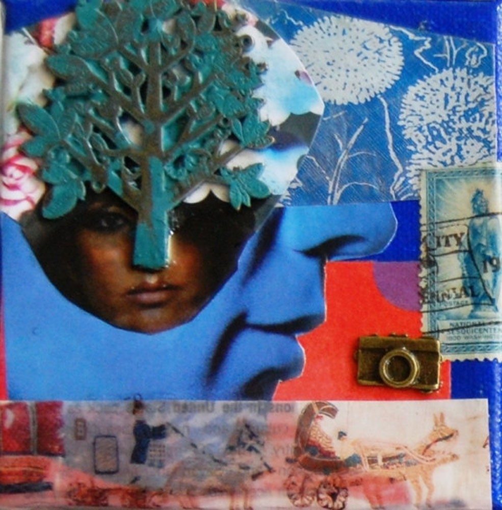 This is a mixed media piece, on a 4" x 4" canvas. The canvas is layers with handmade and vintage papers, acrylic paint, distress ink, Vintage stamps, metal tree and patina. (piece is varnished for protection, signed and dated on the back.)