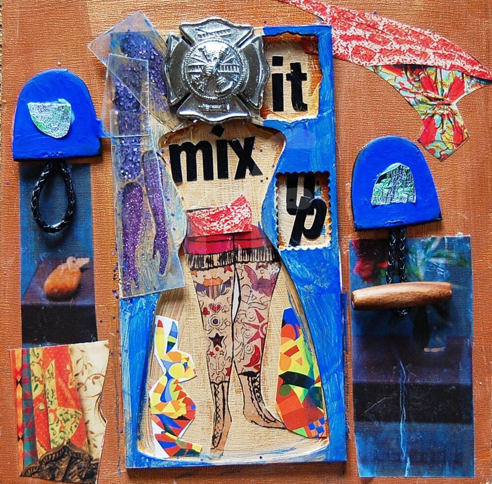 8x8 Mixed Media on a Wood Panel. Made from acrylic paints, mica, leather, toggle fastener, glitter, decorative paper, acetate, vintage silver badge, magazine scraps, vinyl letters, mannikin form background chipboard, wood, and ink.