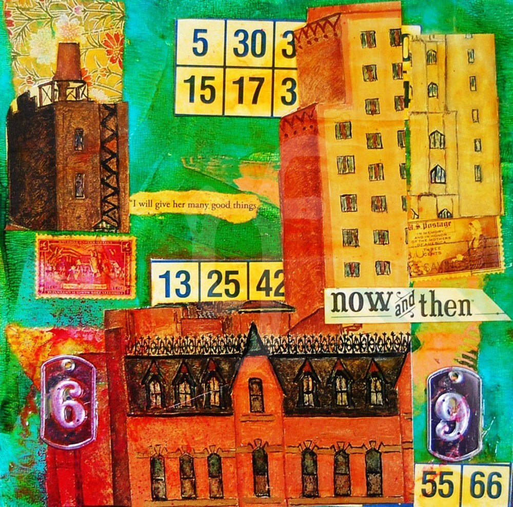 8x8 Mixed Media on a Wood Panel. Made from acrylic paint, handmade paper, decorated paper, Bingo game card, magazine scraps, ink, metal numbers, and metal dog tags. Text: "I will give her many good things.."