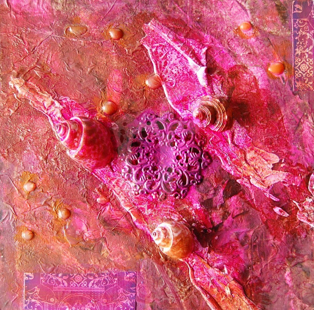 8x8 Mixed Media on a Wood Panel. Made from acrylic paint, sea shells, metal flower, decorative paper, handmade paper, plaster/spackle, acrylic inks, and varnish.