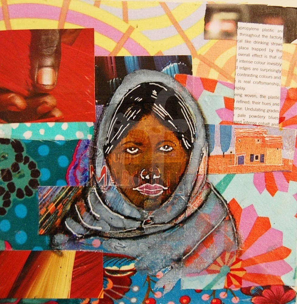 8x8 Mixed Media on a Wood Panel. Made from acrylic Paint, handmade paper, markers, acrylic ink, text, photo images, decorative paper, oil paint, and fabric.