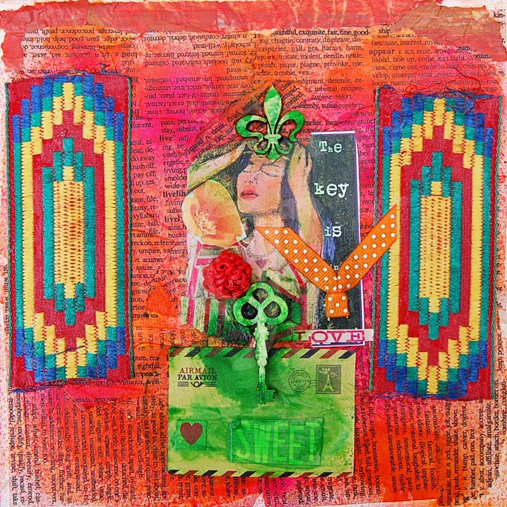 8x8 Mixed Media on a Wood Panel. Made from acrylic paint, ink, dictionary pages, photo, markers, ribbon, wood charm, button, woven fabric, decorative paper, key, and mini-envelope.