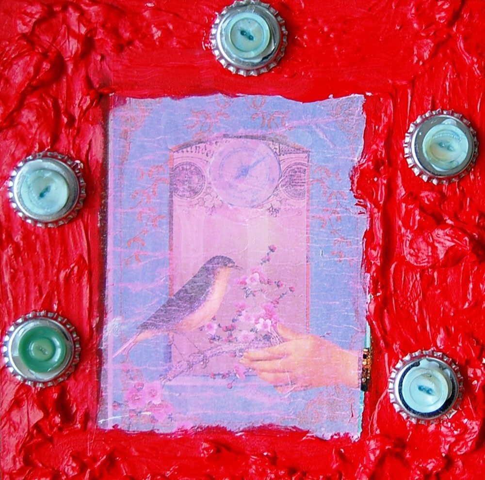 8x8 Mixed Media on a Wood Panel. Made from acrylic paint, magazine scraps, vintage buttons, plaster, ink, bottle caps, cardboard, and tissue.