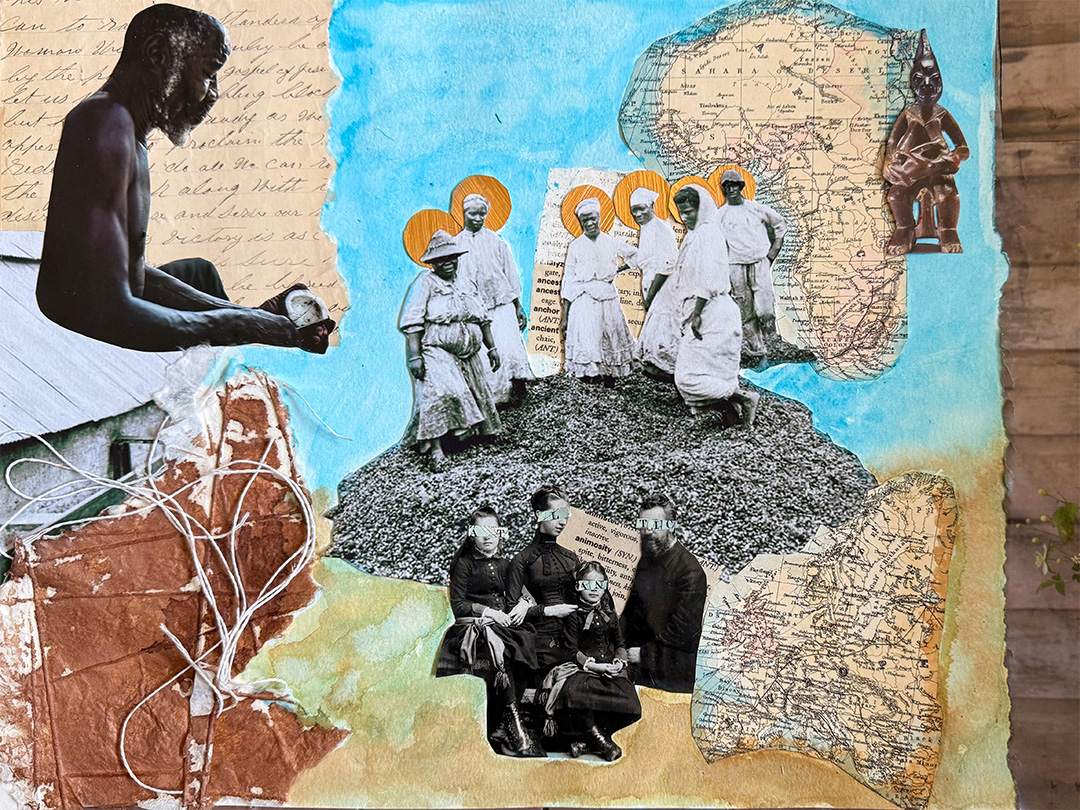 The artwork merges collage elements to tell stories of the past and present weaving a tale of legacy.
