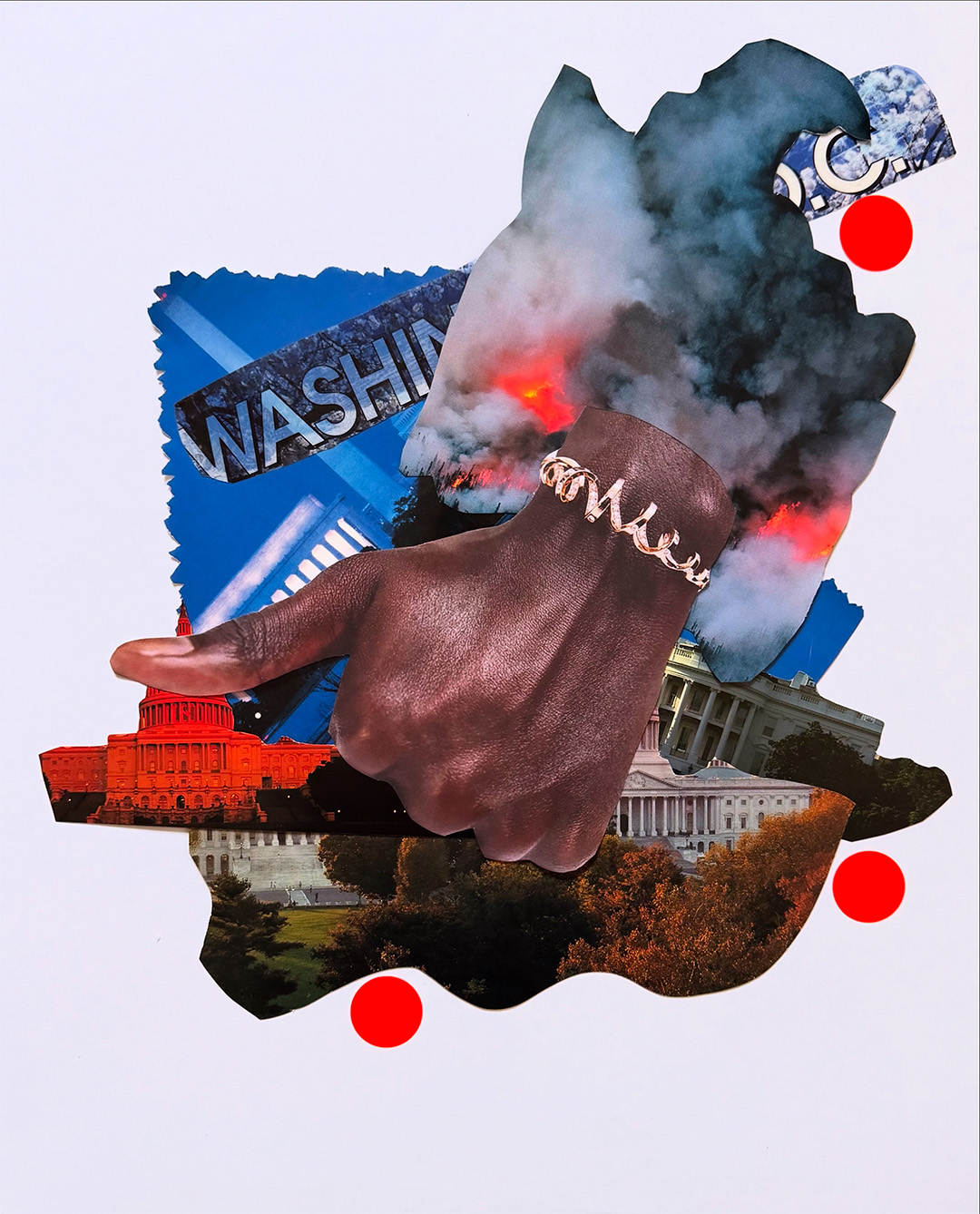 A surreal composition juxtaposing iconic structures and abstract shapes; exploring themes of power through layered textures and bold colors.