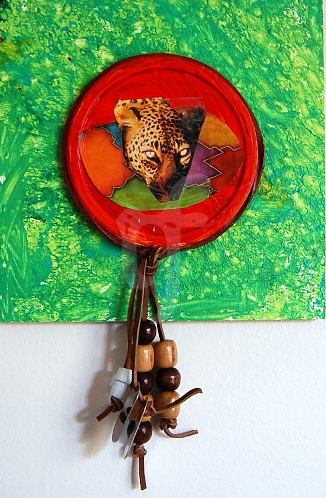 8x8 Mixed Media on a Wood Panel. Made from acrylic paint, acrylic ink, genuine leather, wood beads, glass beads, dog tags, cardboard, plastic top, mica, and magazine scraps.
