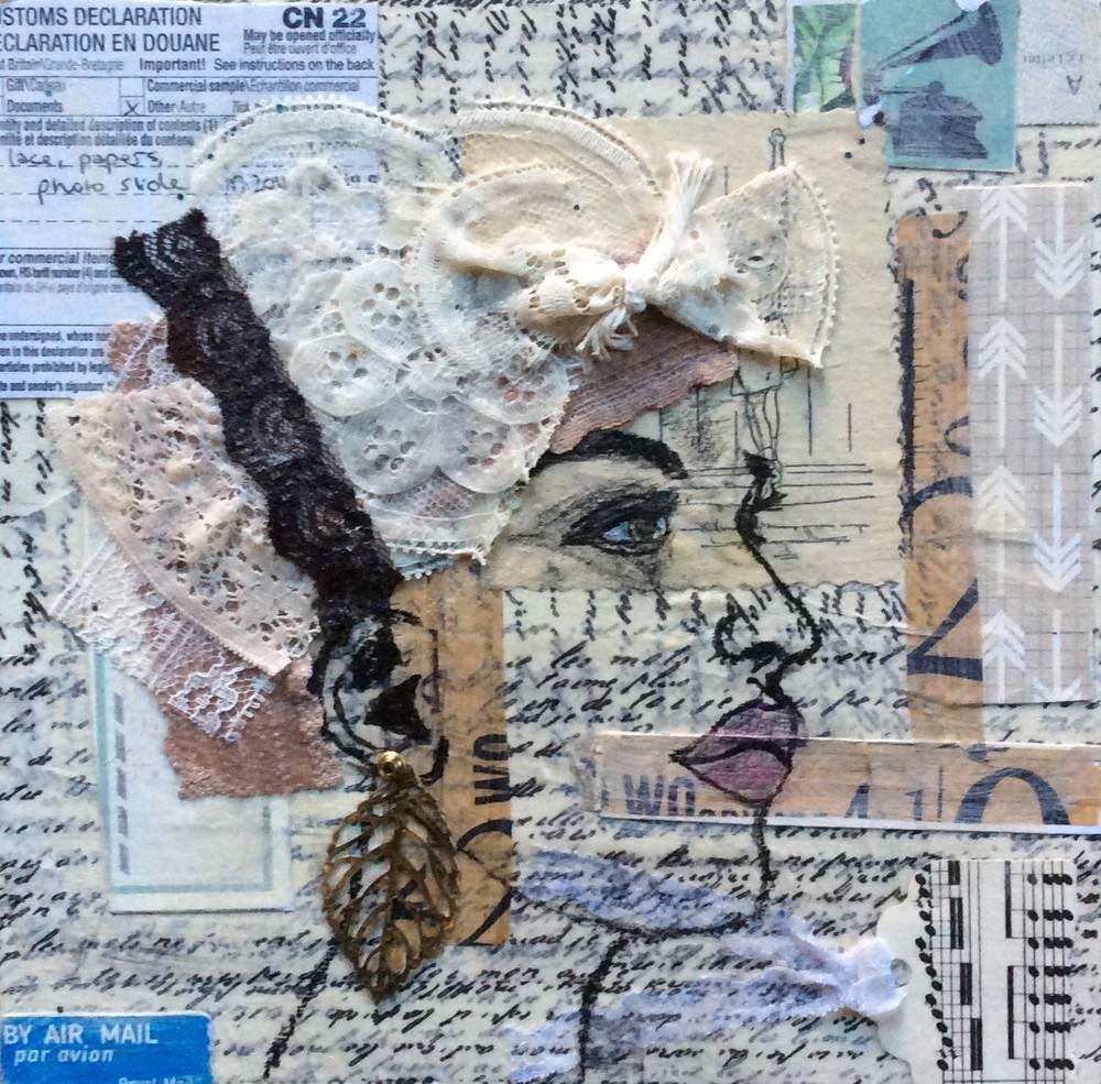This mixed-media original painting is a 8 x 8 x .78 inch wood panel. This painting was created with vintage papers, acrylic paint, charcoal, graphite, vintage lace, metal, vintage handwritten letters, and layers of handmade paper.