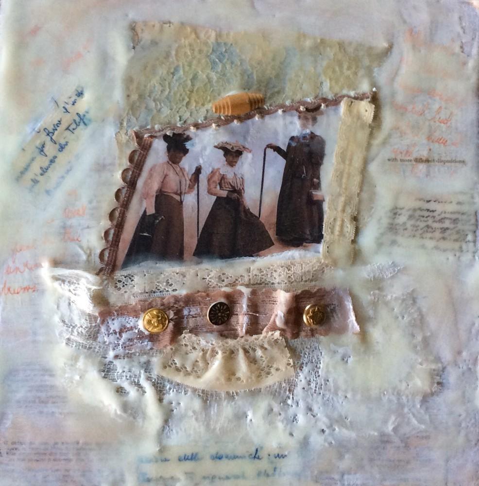 This mixed-media original painting is a 12 x 12 x 1.5 inch birch wood panel. This painting was created with acrylic paint, vintage papers, encaustic paints, charcoal, photo, vintage lace, buttons, wood, thread, vintage handwritten letters, and layers of handmade paper.