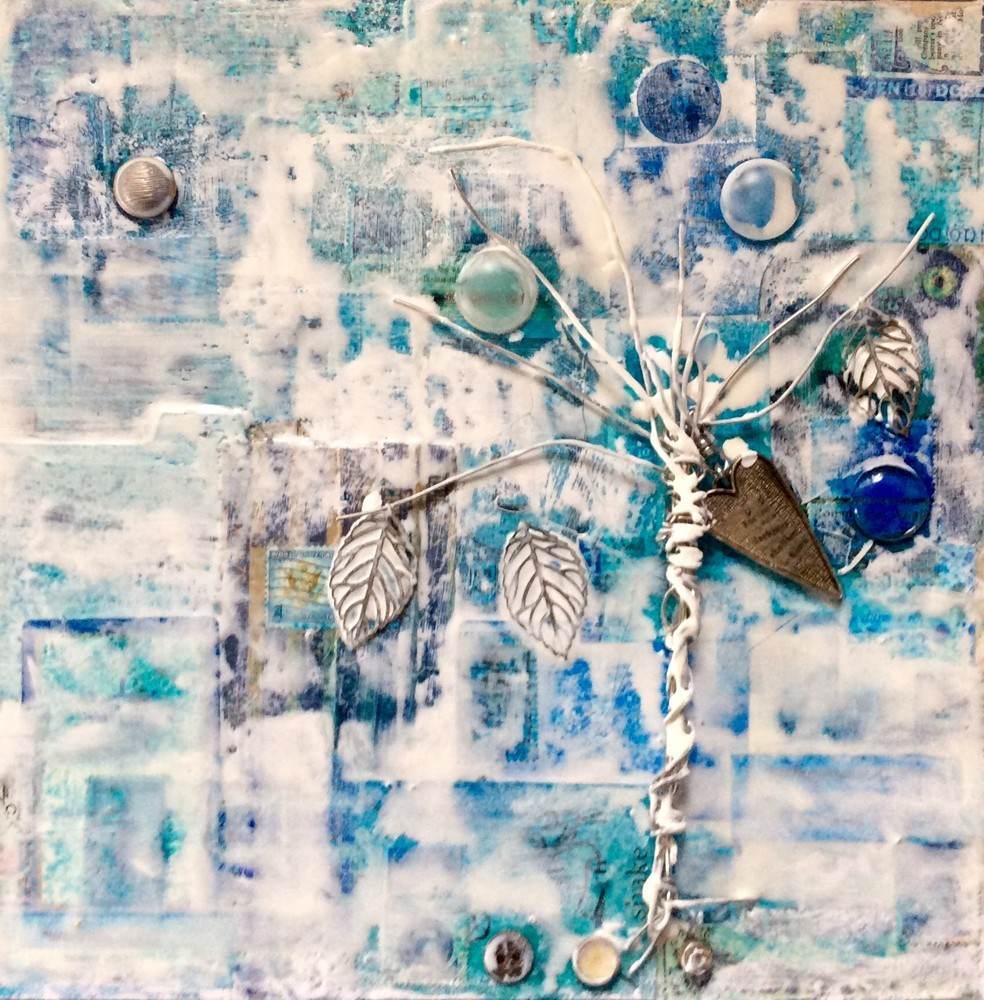 This mixed-media original painting is a 12 x 12 x 1.5 inch birch wood panel. This painting was created with layers of vintage papers, encaustic paints, wire, metal buttons, metal leaves, cabochons, resin, metal heart and handmade paper.