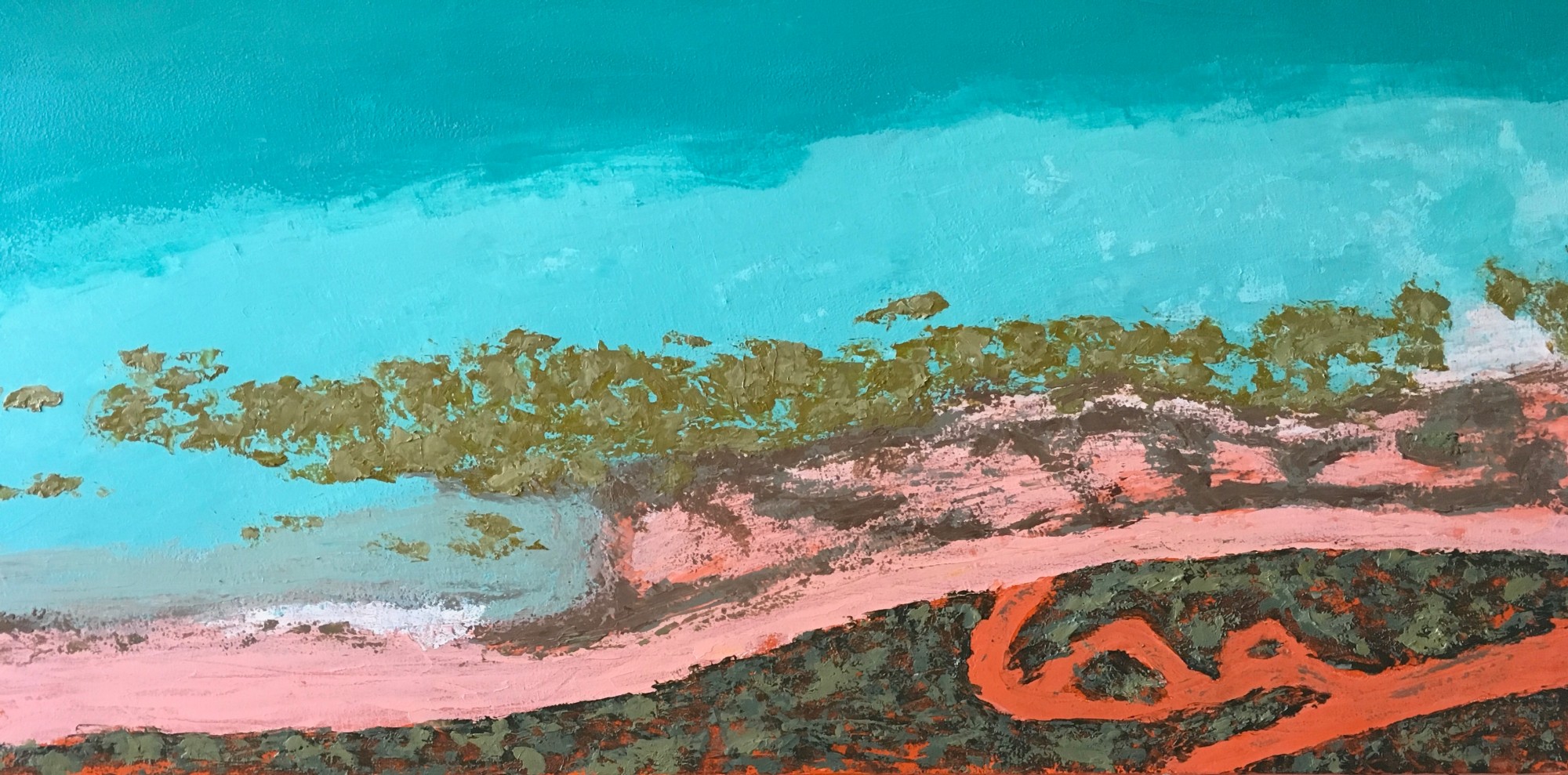 Inspired by the sight of the coast from the aeroplane whilst flying into Broome. The contrast of the red ochre against the turquoise sea is awesome. Roads cut through the scrub like scars in the red desert. Mainly worked with palette knife.