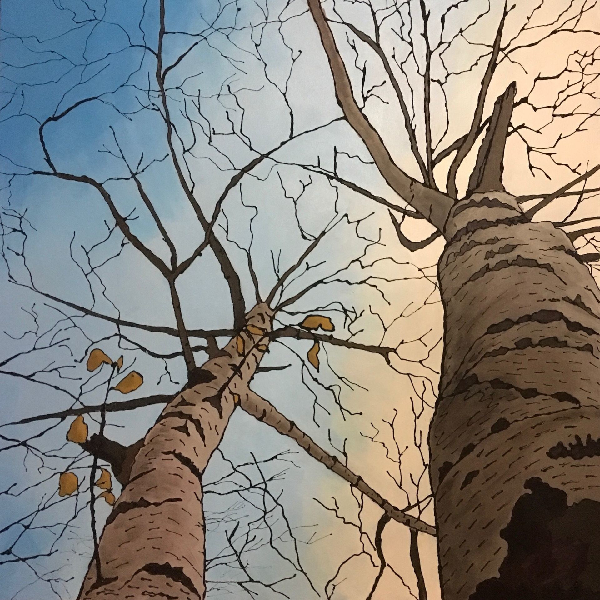 On a crisp Winter's morning the birch trees in Jindabyne stand tall and bare , sentinels to the rising sun, bare branches reaching for the light.