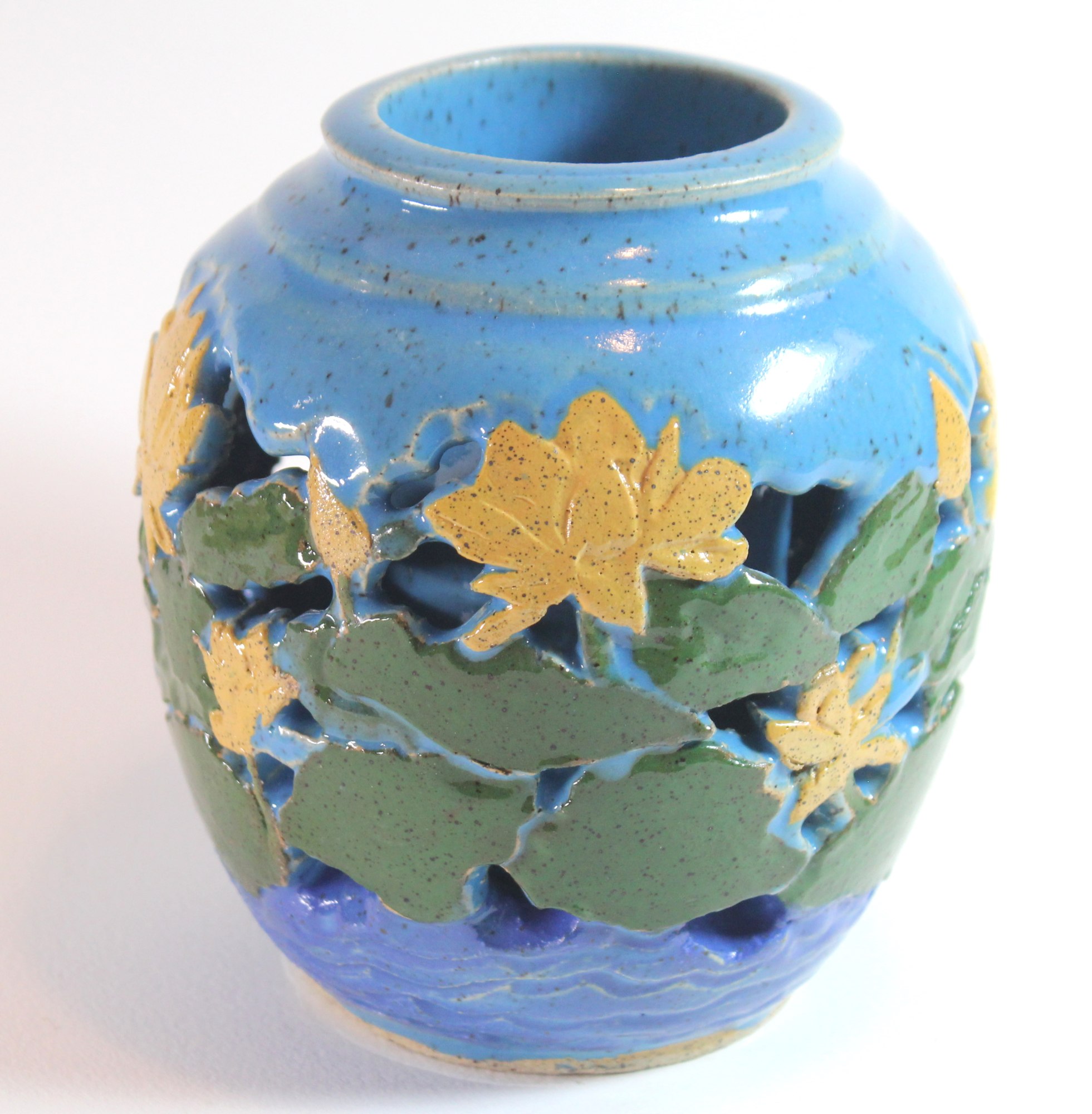 Carved Double-Walled Vase, Turquoise With Water Lilies