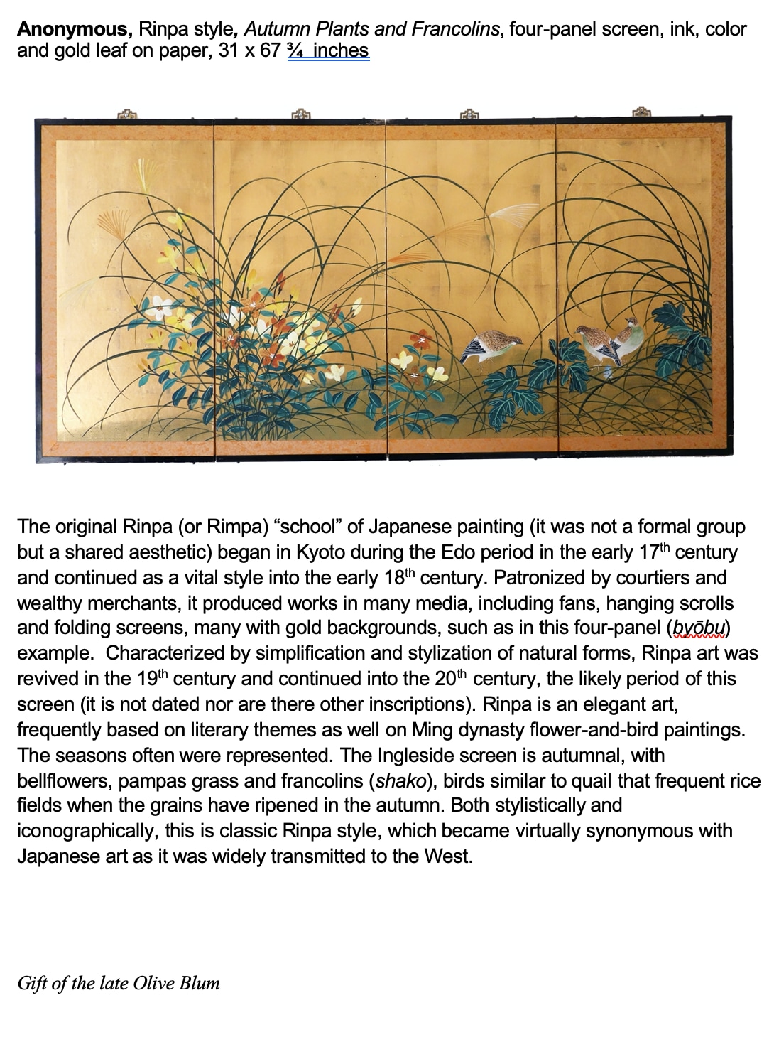 A four-panel screen, Rinpa style, probably 20th century. For further information, see Richard Spear, "Art in the Dining Room," revised September 2022, by clicking on the second image. Gift of former IRC resident Olive Blum.