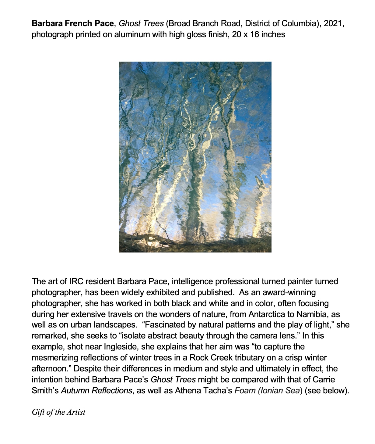 The artist explains that her intention was “to capture the mesmerizing reflections of winter trees in a Rock Creek tributary on a crisp winter afternoon.” Donated by photographer and IRC resident Barbara French Pace. For further information, see Richard Spear, "Art in the Dining Room," revised September 2022, by clicking on the second image.