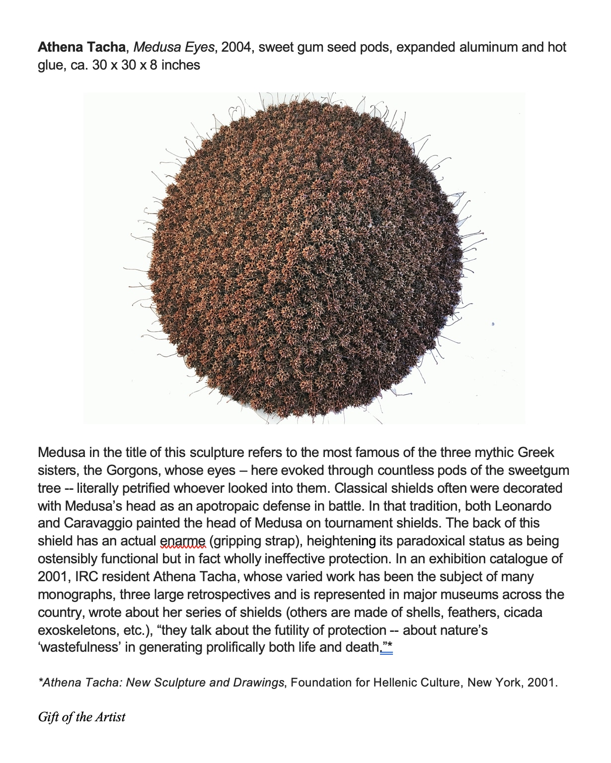 Referring to her series of shields (the title of this one refers to Medusa, the mythic Gorgon whose eyes petrified whoever looked into them), Tacha stated that "they talk about the futility of protection -- about nature’s ‘wastefulness’ in generating prolifically both life and death." Gift of IRC resident and artist Athena Tacha. For further discussion, see Richard Spear, "Art in the Dining Room," revised September 2022, by clicking on the second image.