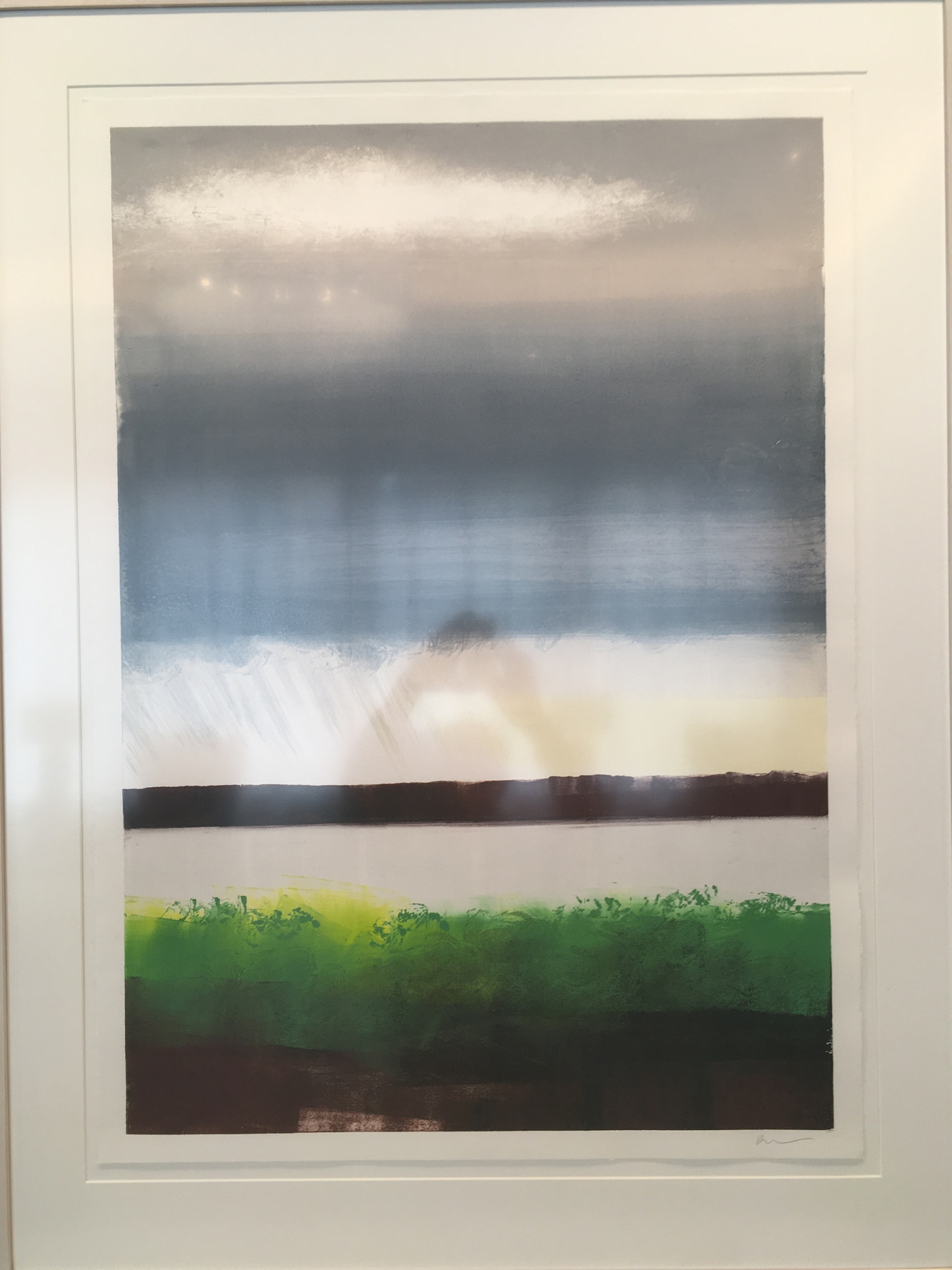 Print at left inscribed "Early Spring," ed. 1/1; print at right signed. Dimensions of the pair. Print on the left inscribed, "Crescent Beach/Purple Gold;" print on right signed. Rachel Burgess earned an MFA from the School of Visual Arts in NY. "I make monotype landscapes that explore the relationship between memory, truth and storytelling" she stated. "My landscapes are inspired by real places that I edit and abstract to mimic the effects of memory. ... I 'paint' on a sheet of plexiglass, starting at the top and working my way down. I continue to distill the composition until it stops representing a specific place and becomes something abstract, archetypal. ... then I print the piece in one go and wipe the plexiglass clean, as though the painting never existed. I am left with a new work on paper that, like a memory, replaces everything that led to its creation. " Purchased for buildings 8 and 9 by art consultant Pam Frederick.