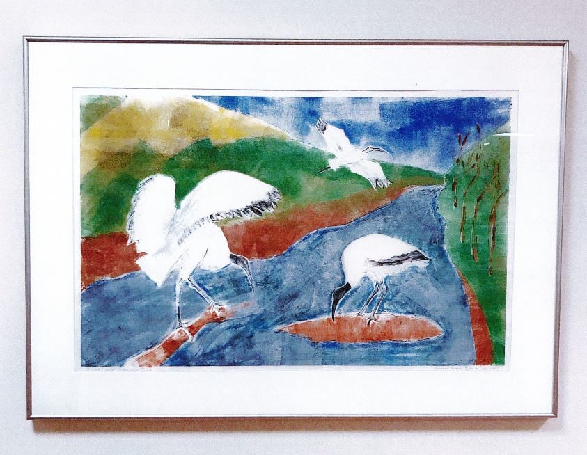 Pamela Wedd Brown, who studied art at the Académie Julian and École des Beaux Arts in Paris, has remarked about her work that it is "essentially autobiographical or perhaps shorthand records of my life's experiences. My Zen Sumi-e teacher in Tokyo, Oi sensie, said: 'Make Universe.' I believe my work is a distillation of my universe." A variant of this print hangs in the Health Center. Unrecorded status but presumably donated or loan by IRC resident-artist Pamela Wedd Brown.