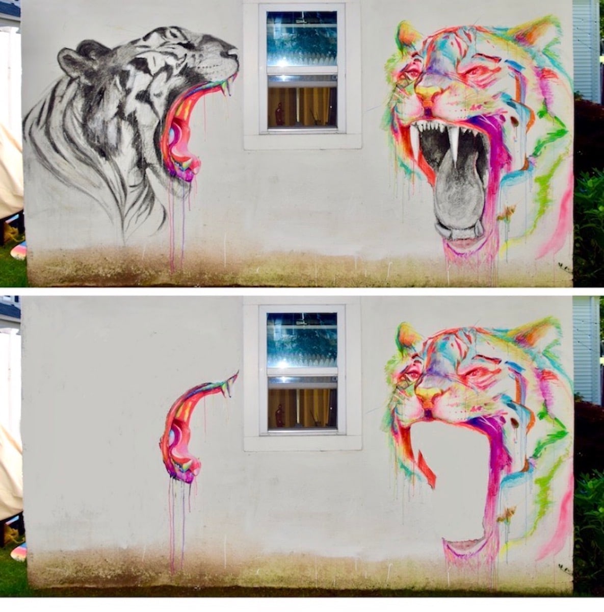 Painted during quarantine on my garage wall. Inspired by the protests and politics of summer 2020. Giving voice, more listening and action, starting with myself. Partially drawn with nonpermanent charcoal which washed away in the rain.