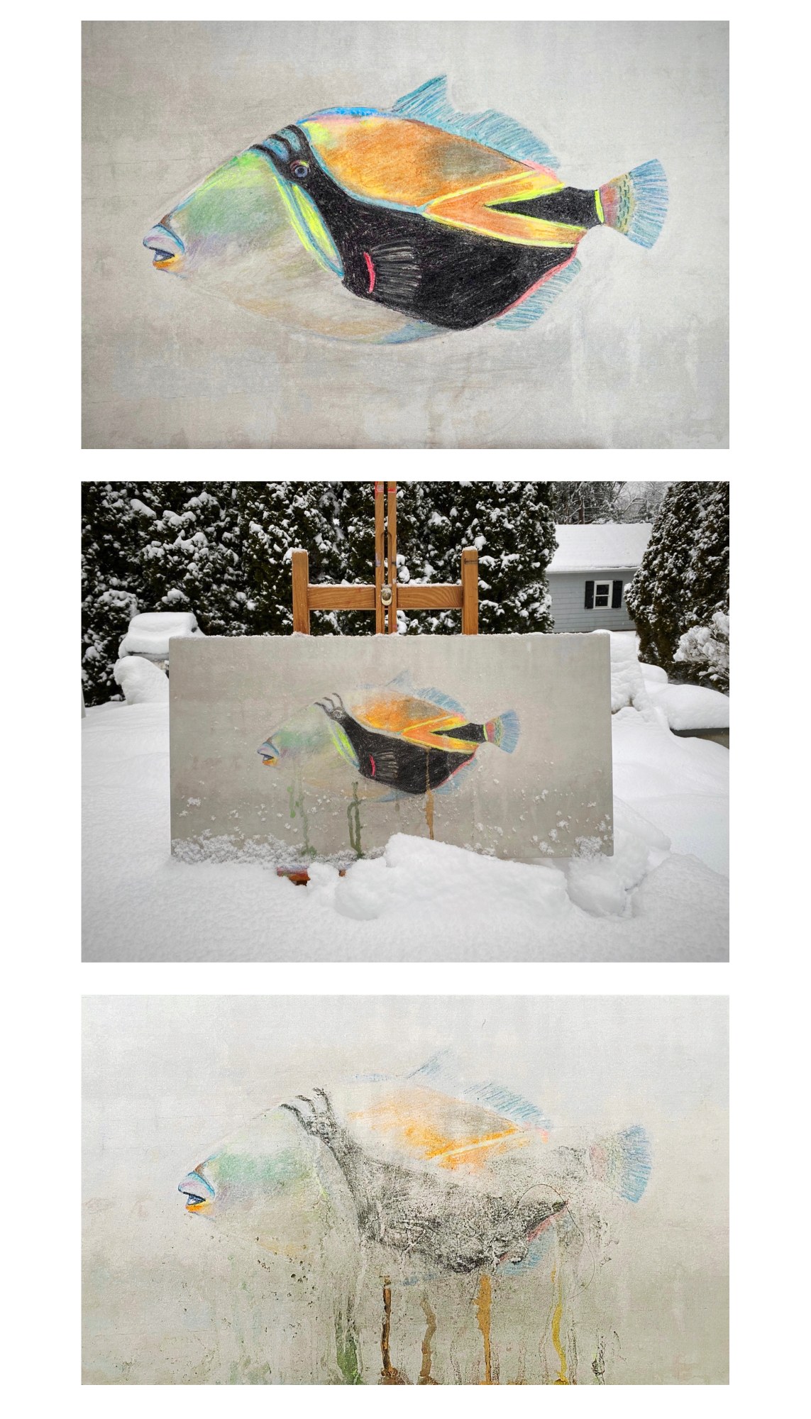 Vanishing Humuhumunukunukuapua'a (Hawai'i State Fish) in a Connecticut snowstorm. Quarantine art - reaching out to connect across the country beyond closed borders.