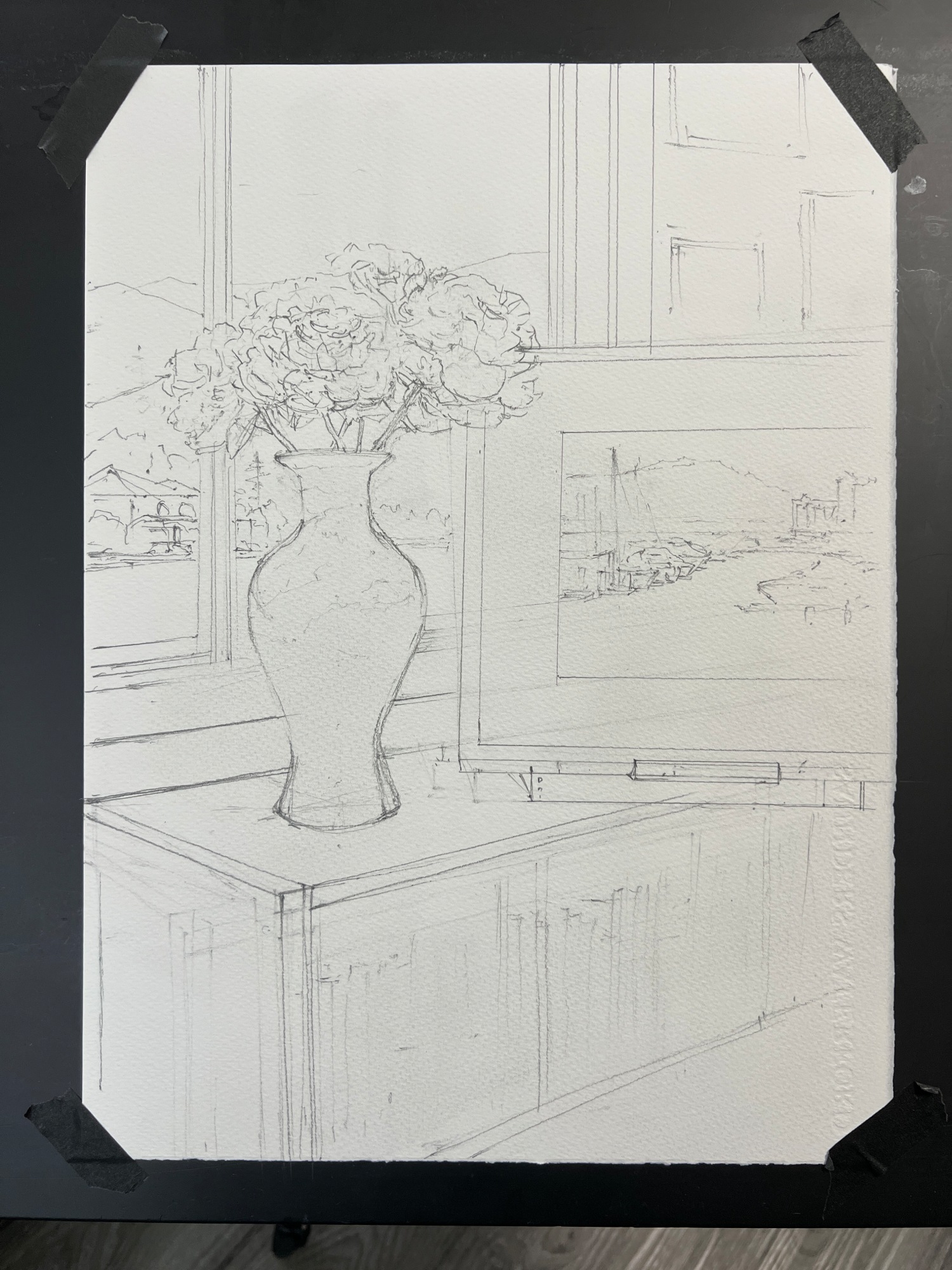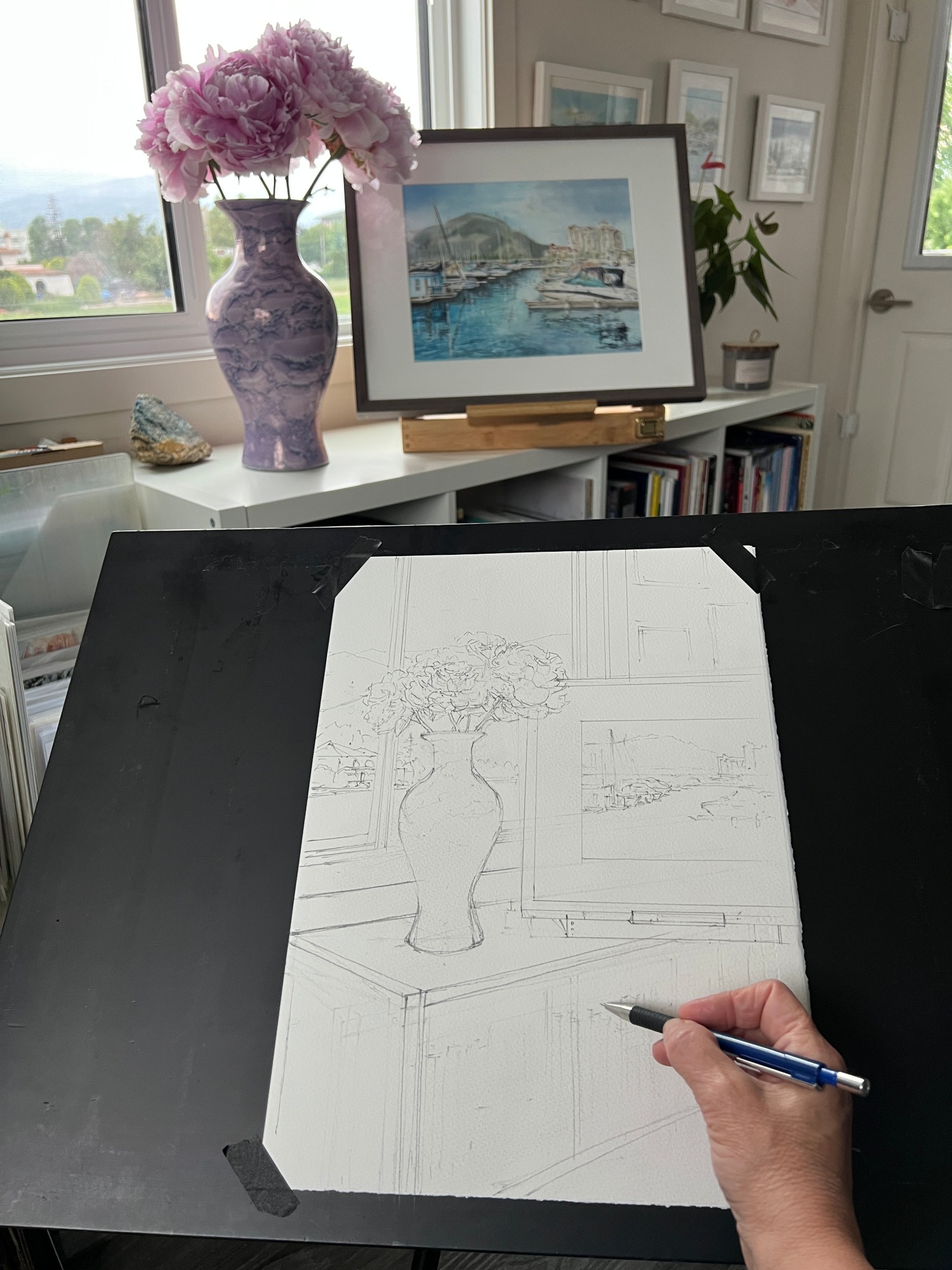 "June Serenade: A Glimpse of Morning Harmony" is a captivating watercolor painting that captures the tranquil essence of a June morning. The artwork depicts a harmonious blend of elements, showcasing a part of the artist's studio at home.