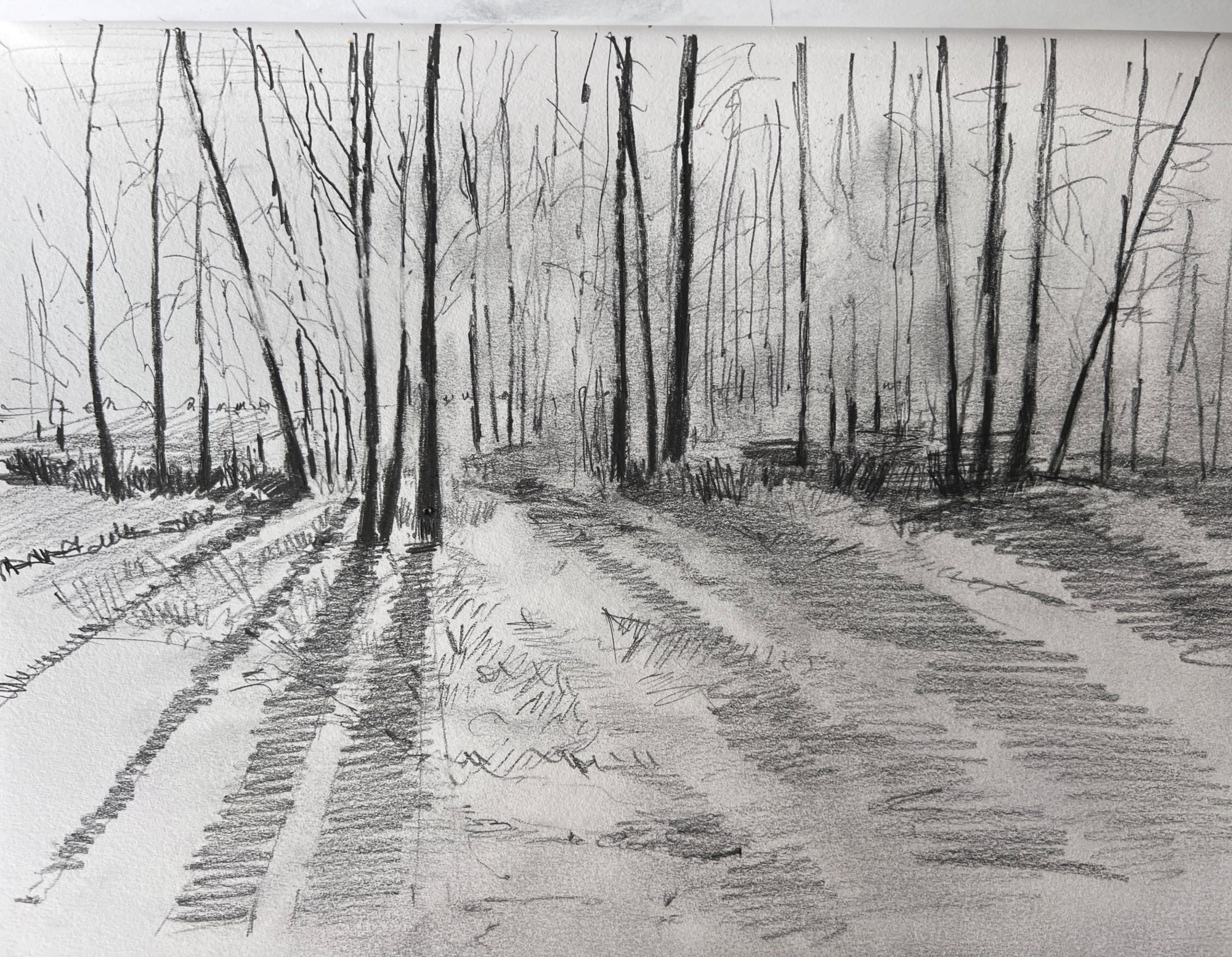 "Christmas Morning in Alberta, Canada" is a vivid watercolor painting that captures the serene beauty of a wintry forest scene. The artwork features a stand of slender trees, their bare branches etched against a softly lit sky that hints at the early morning hours. Shadows of blue and grey stretch long and cool across the snow, suggesting the quiet hush of Christmas morning. The painting's loose, expressive brushwork adds a dynamic quality to the tranquil scene, conveying the crisp, fresh atmosphere of a winter in Alberta. This piece perfectly embodies the peaceful solitude and the stark beauty of the Canadian winter landscape.