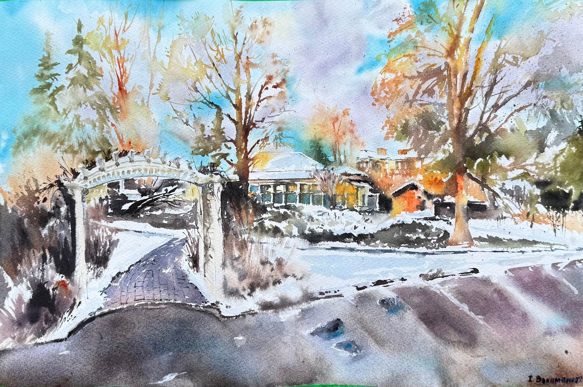 This original watercolor painting by Irina Bakumenko captures the tranquil beauty of Guisachan Heritage Park in Kelowna, BC, during the season’s first snowfall. The scene features a charming arched gateway, snow-covered paths, and a peaceful garden landscape, all delicately rendered with expressive brushwork and a soft, atmospheric palette. The warm tones of lingering autumn leaves contrast with the fresh snow, evoking a sense of quiet wonder and seasonal transition.