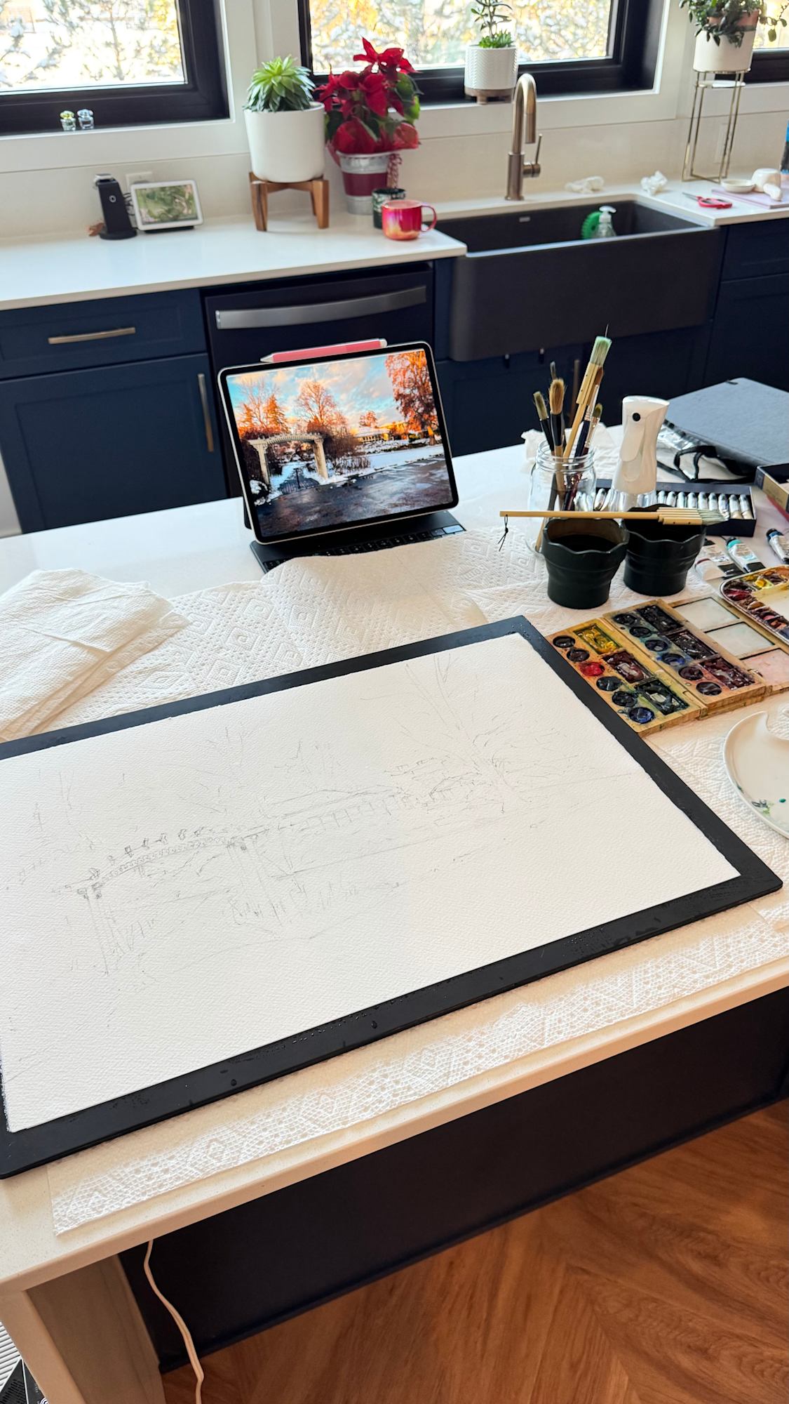 This original watercolor painting by Irina Bakumenko captures the tranquil beauty of Guisachan Heritage Park in Kelowna, BC, during the season’s first snowfall. The scene features a charming arched gateway, snow-covered paths, and a peaceful garden landscape, all delicately rendered with expressive brushwork and a soft, atmospheric palette. The warm tones of lingering autumn leaves contrast with the fresh snow, evoking a sense of quiet wonder and seasonal transition.