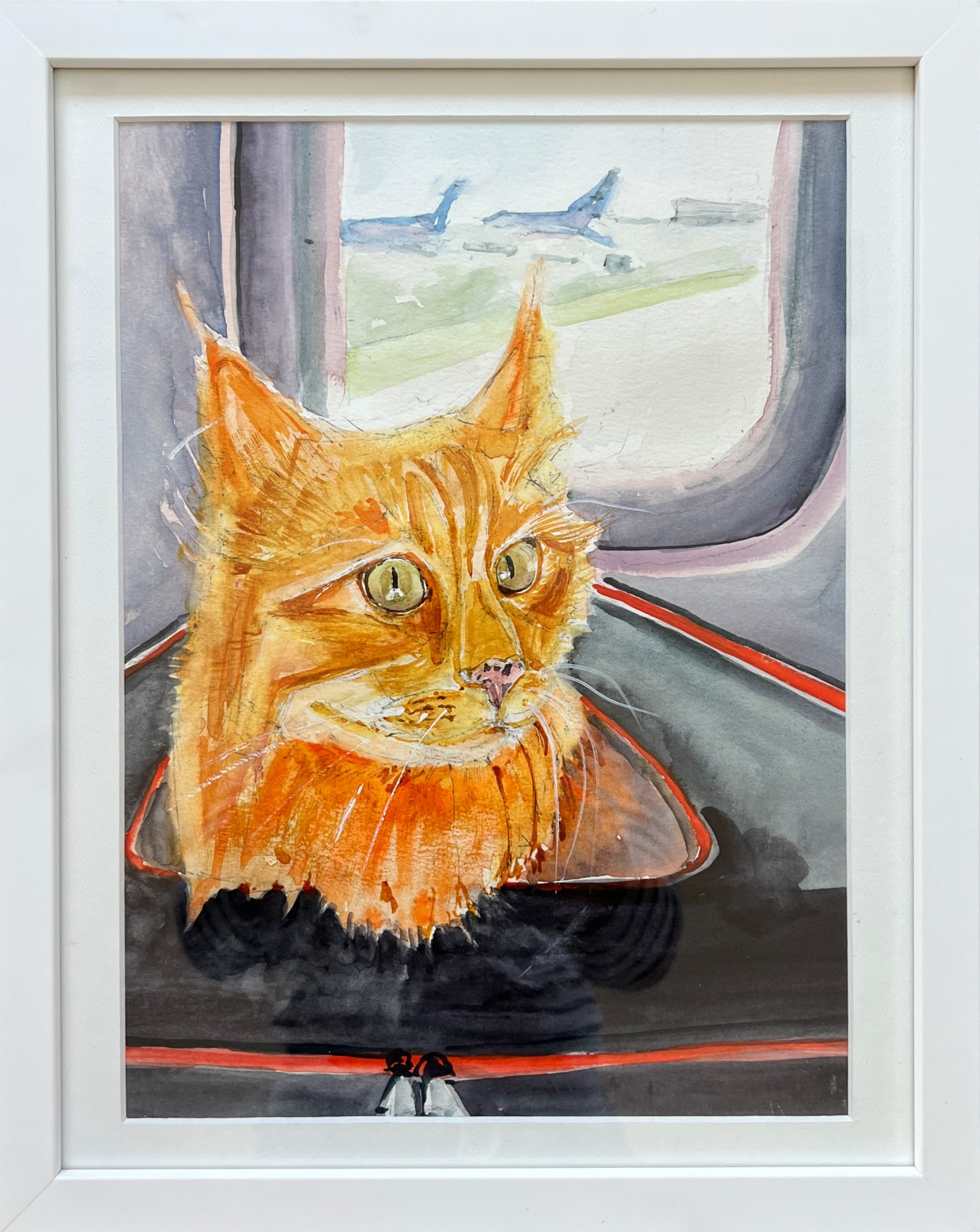 Journey of Ginger: Departure" captures the poignant moment when Lars, our beloved ginger cat, embarked on an adventure with us to Canada. The painting depicts Lars positioned in front of an airplane window, with the sprawling airport of our native city visible in the background. Lars' expression reflects a mix of curiosity, anxiety, and anticipation, as he faces the unfamiliar surroundings and the unknown ahead. This artwork serves as a visual representation of the emotions and experiences associated with leaving behind our home and venturing into a new chapter of our lives.