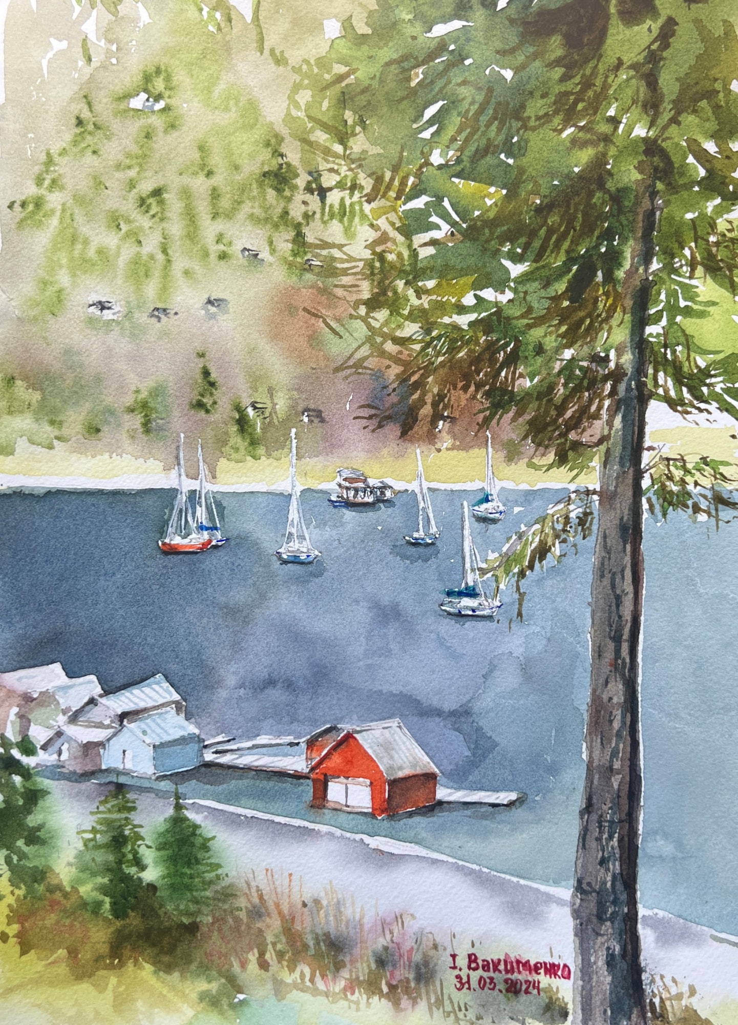 This watercolor painting titled "March in Kaslo, BC, Canada" beautifully captures a serene lakeside scene in early spring. Framed by a towering evergreen to the right, the composition looks out over a calm lake dotted with sailboats. On the shore, a collection of quaint, colorful boathouses adds a charming touch, reflecting the tranquil lifestyle of the lakeside community. The artist uses a palette of earthy greens, soft grays, and vibrant reds, evoking a peaceful, crisp early spring day in Kaslo. The painting conveys both the quiet beauty of the region and the slow awakening of nature as winter recedes.