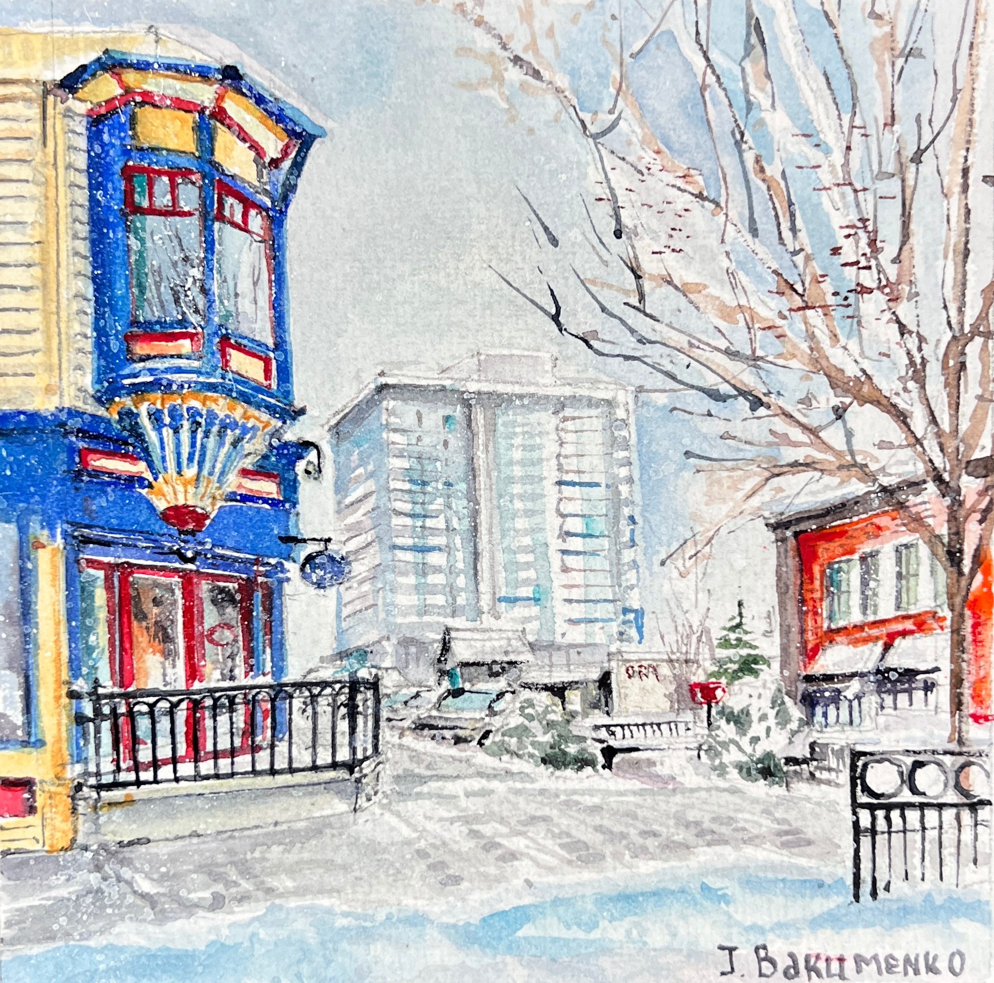 This painting portrays a quaint and colorful street scene during winter, likely Pandosy Street, with the charming Marmalade Cat Cafe as its centerpiece. The cafe boasts a striking blue upper facade with vibrant red accents around the windows and doorway, invoking a warm, welcoming atmosphere. Snow blankets the ground and rooftops, and leafless branches dusted with snow suggest the cold season. The background features modern architecture, contrasting with the cafe's historic character. The artwork is textured, capturing the essence of watercolor with visible brush strokes and paper grain. The signature "I. Bakumenko" personalizes the piece, indicating your artistic creation.