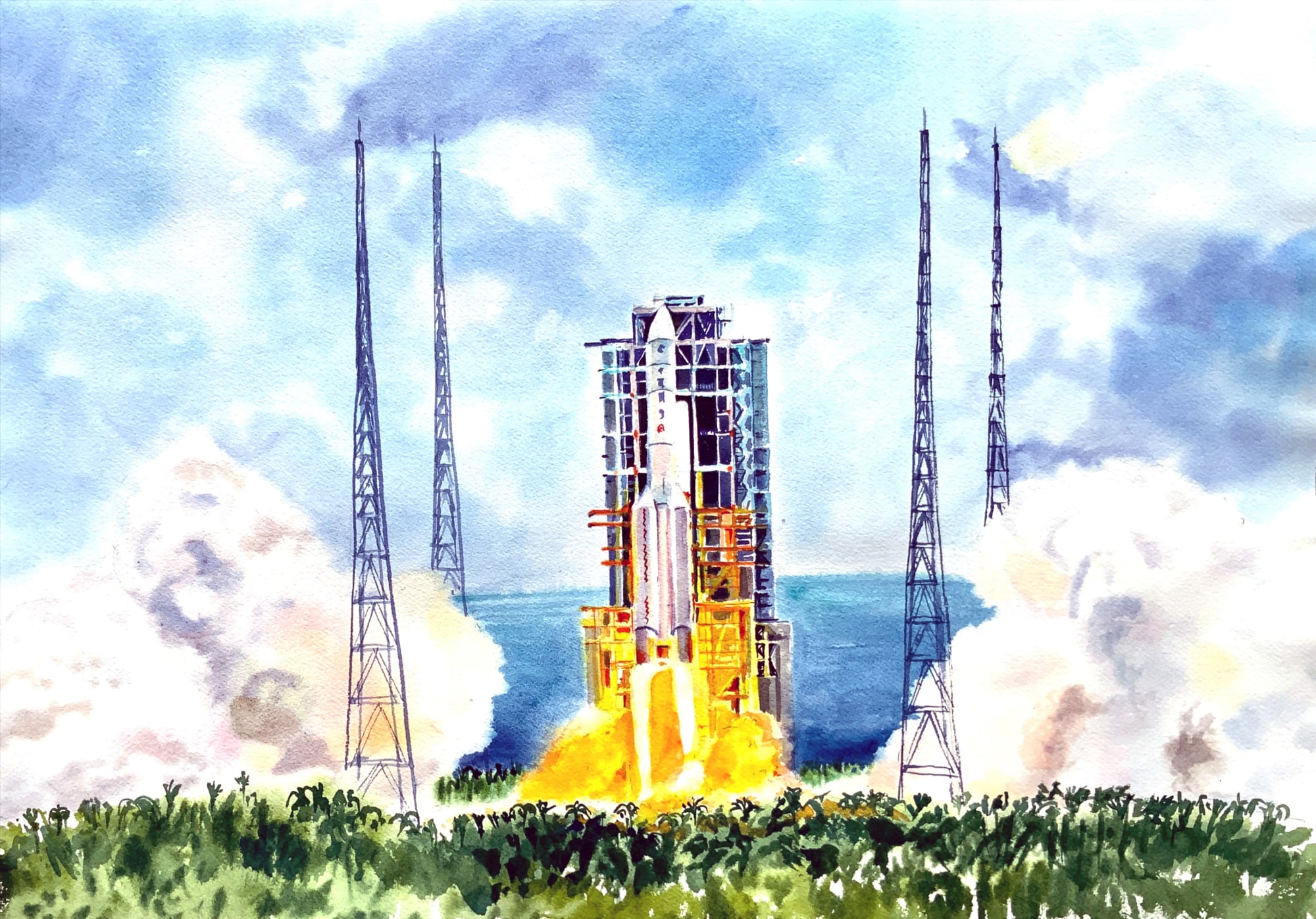 Several months ago, I was invited to take part in exhibition “The World of Watercolor -2021” which set up as a part of the X1 International Festival “Russian-Chinese Fare of Culture and Art”. ⠀ I painted two paintings special for this exhibition. I decided that will be interesting to paint subjects that are important for both countries. ⠀ I selected Spacecraft Launch as the subject to paint. I use photo with Spacecraft Launch Site in Hainan Island, China. It was a Long March 5B rocket carrying a module for a Chinese space station lifts off from the Wenchang Spacecraft Launch Site in Wenchang in southern China's Hainan Province, Thursday, April 29, 2021. China has launched the core module on Thursday for its first permanent space station that will host astronauts long-term. ⠀